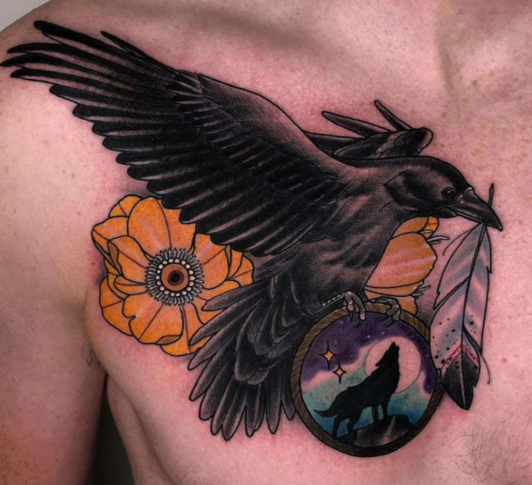 Le dessin d'un corbeau tenant une branche de chêne avec des glands dans son bec ferait très bien l'affaire sur la poitrine. D'autres animaux, insectes et plantes peuvent également être concernés. En plus d'attirer la chance, les tatouages aident à se protéger contre les dangers et les risques.