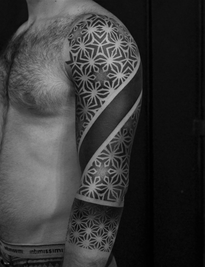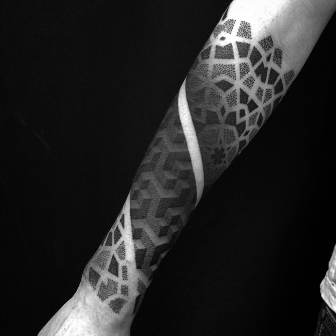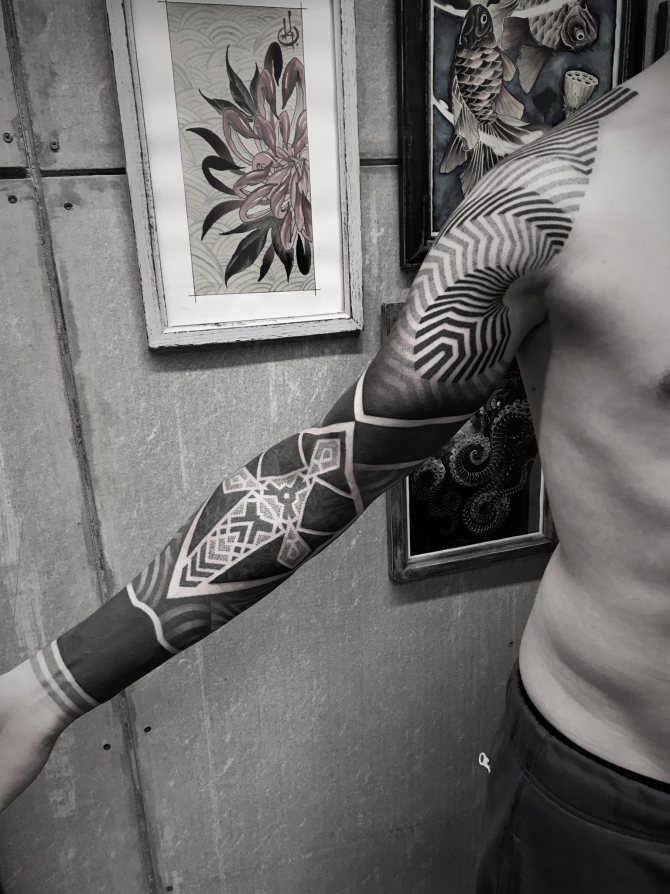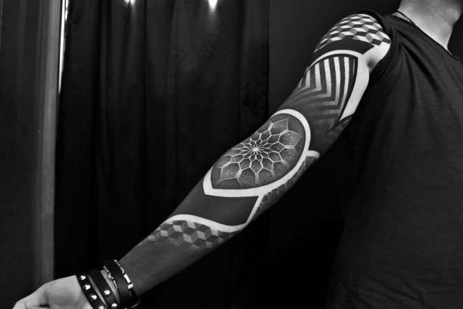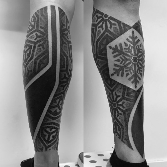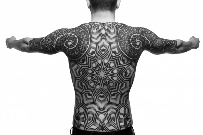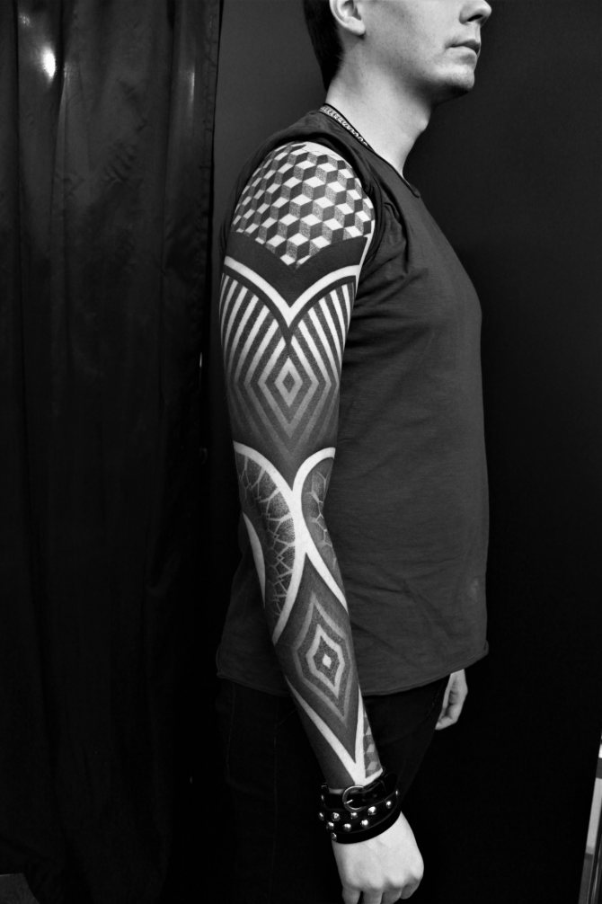 Le Dotwork est l'un des styles dans lesquels je travaille. En général, je fais une collaboration de différents styles et à partir de là, je crée une composition générale. Mais il n'existe pas de nom spécifique pour ce style. Il y a le dotwork, le blackwork, le linework, les effets de gradient, le black&grey. Je joue avec différentes nuances de noir, même dans les ornements. Bien sûr, il y a des œuvres qui ne sont que des points, et s'il s'agit d'une composition - manches, dos et autres grandes œuvres - alors il y a un mélange de styles.