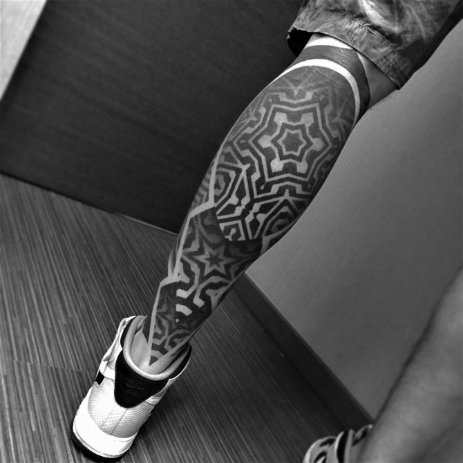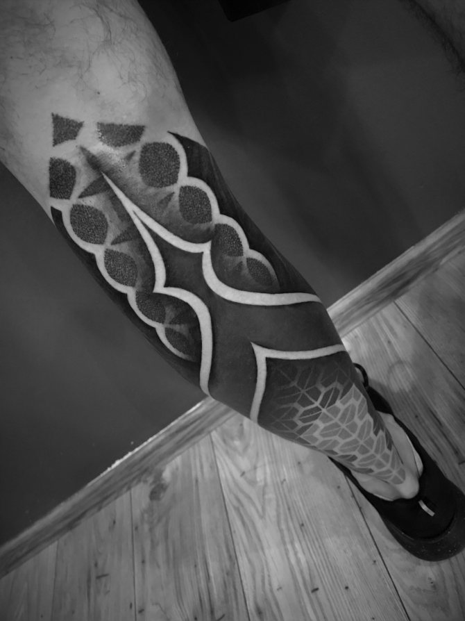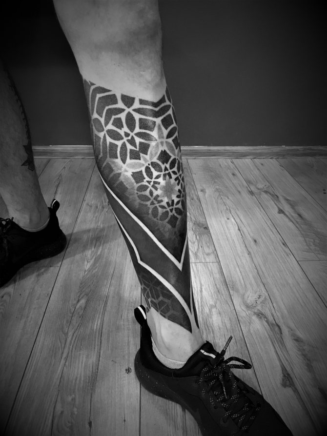 J'ai abandonné la couleur il y a quatre ans, mais il est toujours important pour moi de faire des styles différents. Il est clair que tout est plus ou moins similaire à cause de la couleur noire. Et quand un client arrive, la première chose que je lui demande, c'est ce qu'il aime dans mon travail, ou dans d'anciennes références, pas nécessairement les miennes. Il est important pour moi de comprendre ce qu'une personne aime en général. Si elle est proche de moi, et que je peux en faire quelque chose, alors nous commençons à travailler. La personne me donne une zone de son corps, et je prépare un croquis pour celle-ci. Il peut également s'agir d'un mélange de croquis et de main levée, lorsque je dessine certaines formes sur le corps. Je me mets d'accord avec vous par écrit sur toutes les nuances et tous les éléments de la composition, et dès la première séance, je prépare moi-même l'esquisse : j'élabore les motifs, les mandalas et autres figures géométriques. Il arrive aussi que dans le processus même du travail, quelque chose change, car tout n'est pas réaliste pour montrer une personne sur le papier. Je travaille avec les formes, en adaptant mon travail aux formes du corps. J'aime jouer avec les muscles pour que, lorsqu'ils bougent, le tatouage soit beau et ne se déforme pas.