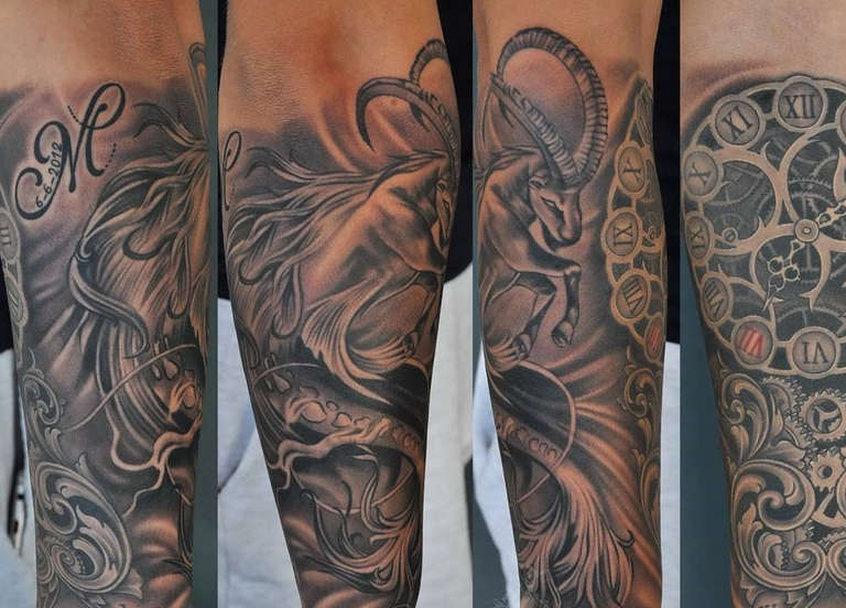 Les mains sont la partie active de l'homme, ce qui signifie que le motif Capricorne sur les avant-bras sera une source de force, d'énergie et de motivation pour le travail et le développement personnel. Veillez à compléter le croquis par des symboles et d'autres détails pour renforcer le sens.