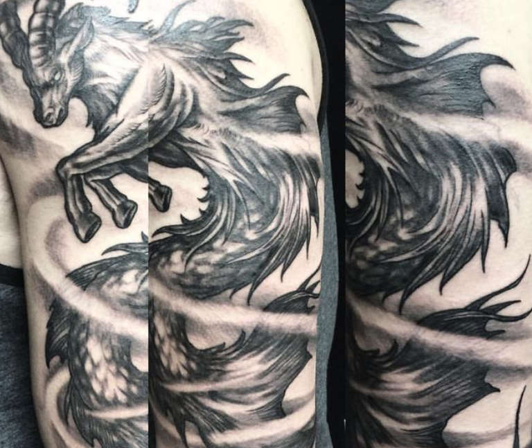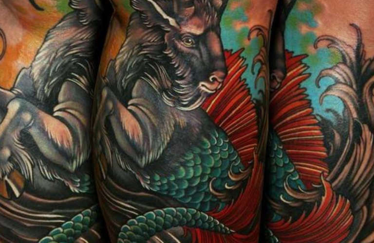 - s'il s'agit d'une chèvre ou d'un bouc avec une queue de poisson, vous pouvez l'appliquer dans une belle composition sur le dos, la poitrine, les pattes, les côtés, les bras afin d'en apprécier les détails ;