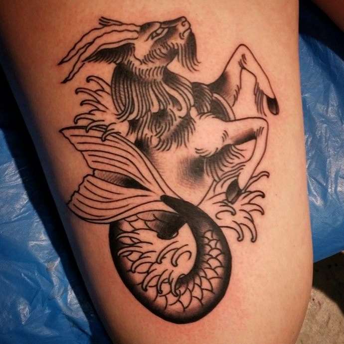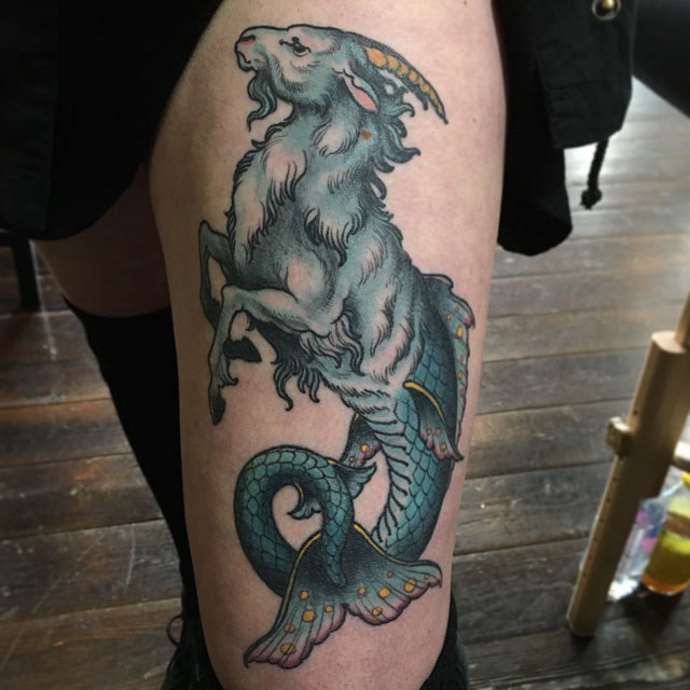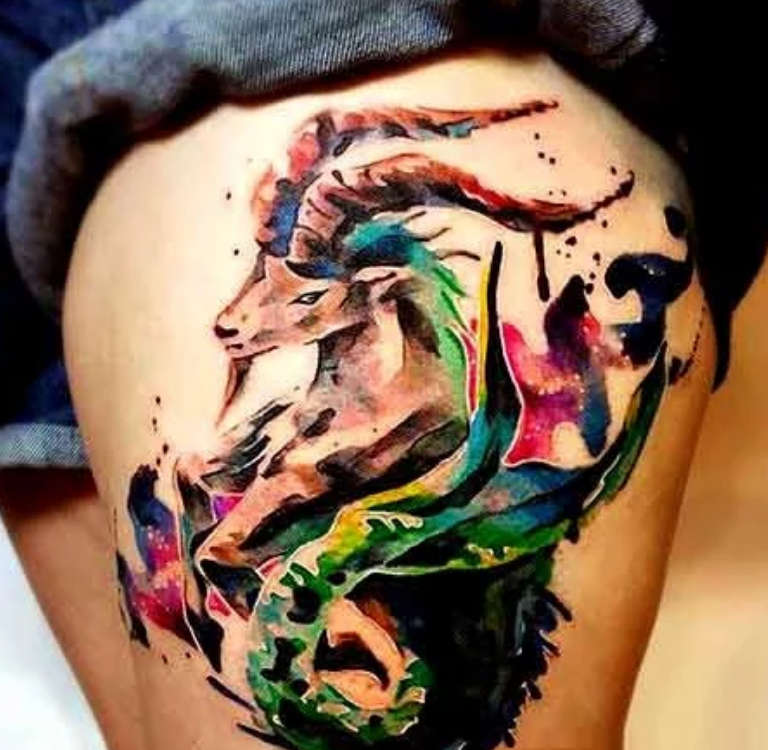 Le meilleur choix pour un tatouage de Capricorne est l'extérieur des cuisses. Dans ce cas, le tatouage renforcera des qualités telles que la détermination, l'esprit de décision, la force intérieure, la volonté d'aller de l'avant avec une vigueur implacable.