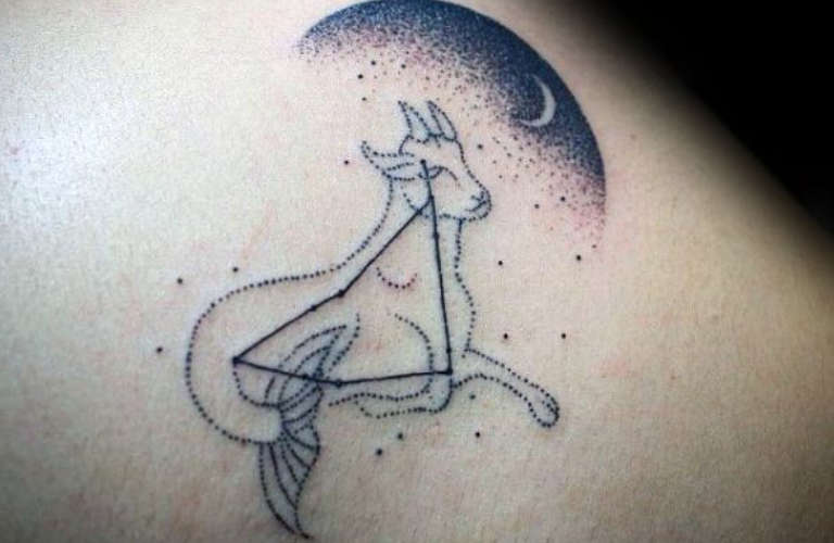 La constellation du Capricorne est la plus difficile à voir à l'horizon, car elle se lève rarement et très bas dans le ciel. Bien qu'elle contienne un nombre considérable d'étoiles, la constellation elle-même et ses symboles sont populaires comme tatouage pour les hommes Capricorne. Le personnage dans ce cas est une créature mythique avec une tête et un corps de chèvre et une queue de poisson.