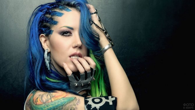 Alyssa White - tatouage d'un œil et coiffure bleue inhabituelle