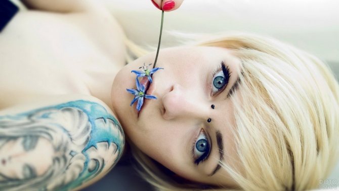 Fille blonde avec un piercing et un tatouage sur l'épaule
