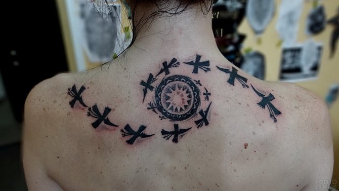 Tatouage avec des oiseaux en cercle sur le dos d'une fille