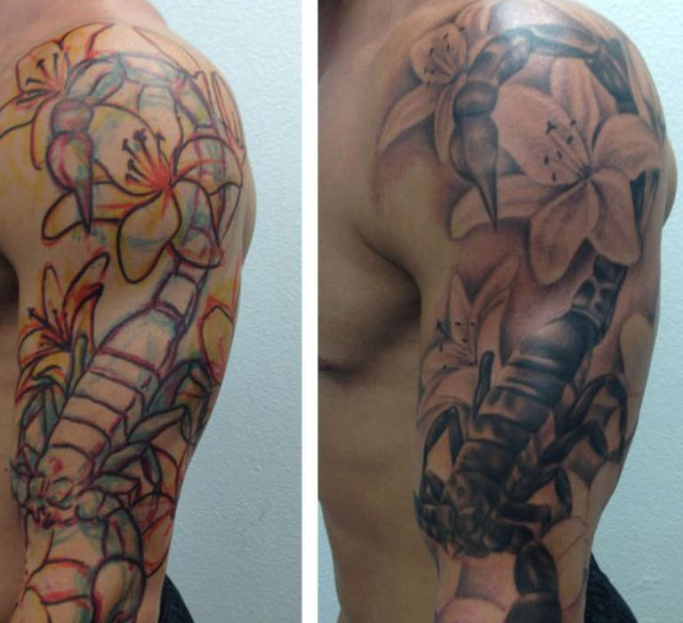 Les couleurs doivent être luxuriantes et vives. Le style new skool, le réalisme, le noir et blanc, le Dotwork, l'aquarelle et le croquis conviennent mieux au Scorpion. Le dessin est bien entouré de fleurs, d'un ciel étoilé ou de formes géométriques.