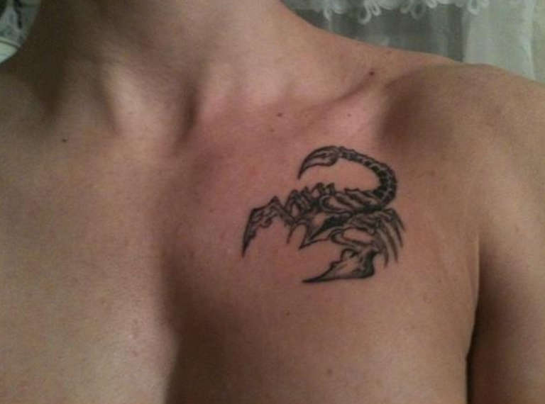 Le tatouage du signe du scorpion est parfait sur le cou, le poignet, sous la clavicule ou sur la poitrine d'une femme. Pour compléter l'image avec quelque chose, vous devrez trouver une zone où il y a plus de place pour un croquis large. Ces tatouages sont souvent placés sur le dos, les jambes ou les épaules.