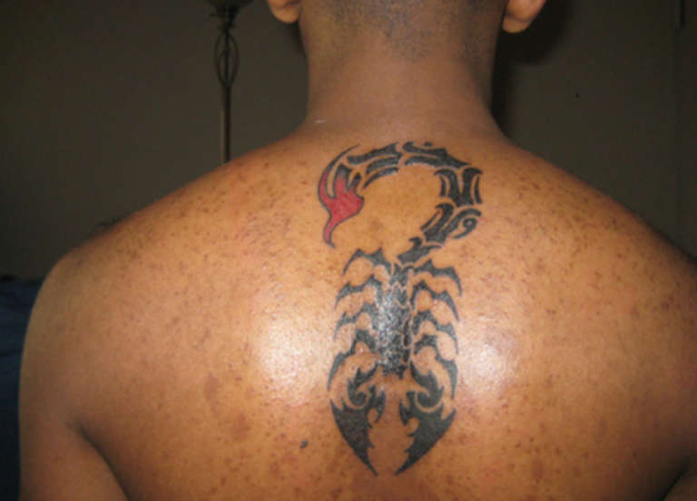 Le dos d'un homme est l'arrière pour protéger la femme qu'il a choisie et sa famille. Le Scorpion à cet endroit est un signe d'avertissement indiquant que l'homme est prêt à attaquer à tout moment, se protégeant lui-même et ses proches des mauvais esprits, du danger.