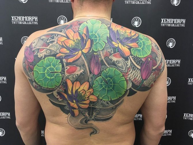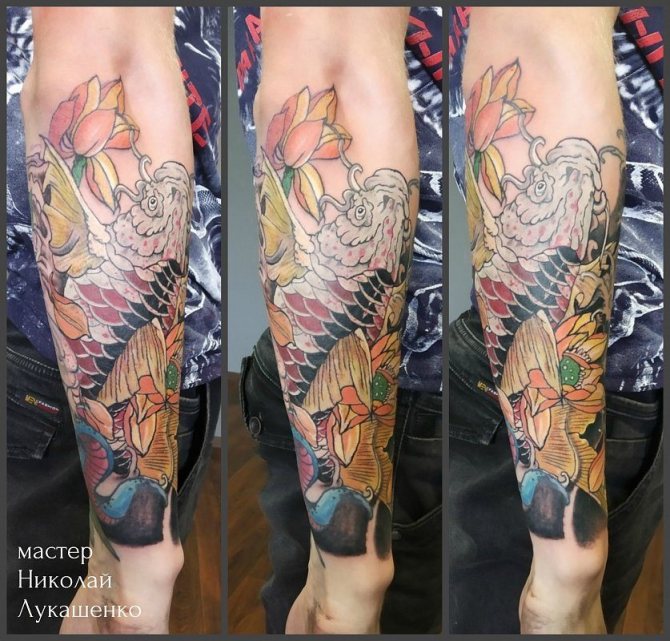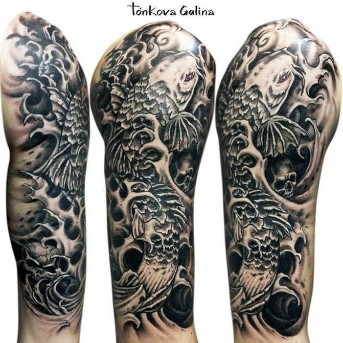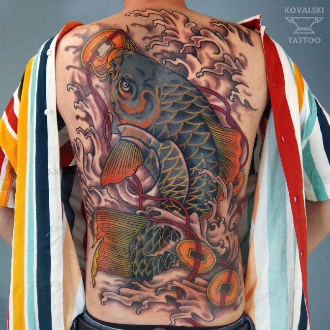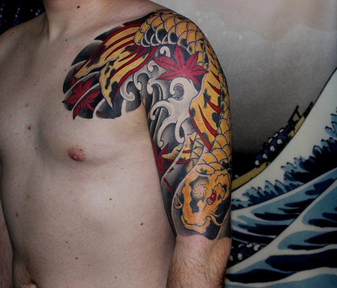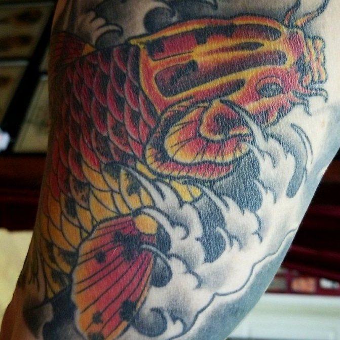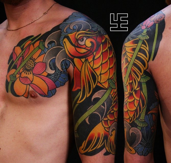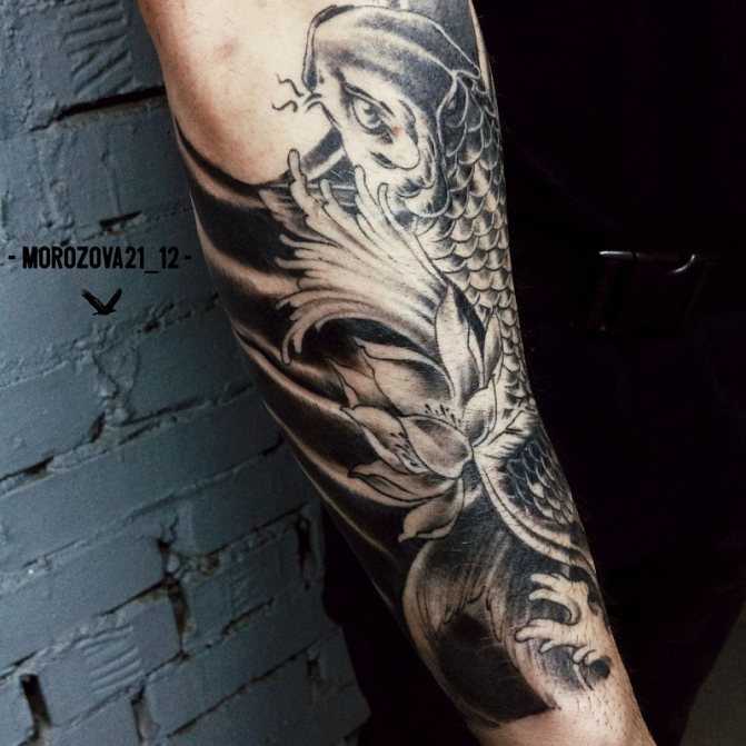 Le koï est un poisson japonais qui a une signification très cachée et intéressante lorsqu'il est utilisé dans les tatouages. Le koï est également appelé carpe. Ce motif est considéré comme un symbole de longévité et d'utilité. Il est très courant pour les gens de se faire tatouer un poisson japonais comme une admonition à leurs buts et objectifs. Très souvent, ce symbole se trouve sur le corps des hommes et porte la force, le courage et la confiance en leurs capacités. En se faisant tatouer un koï, certaines personnes cherchent à surmonter leurs insécurités, à atteindre l'illumination ou même à recevoir un regain d'énergie. Parfois, le poisson japonais est appliqué sur le corps comme un talisman spécial qui attire la chance et la santé. Faites attention au fait que plus la taille du tatouage est grande, plus il attire l'énergie positive de son propriétaire. S'il est placé sur le corps d'une femme, le motif doit être rouge. Les hommes ne devraient jamais faire un koï rouge, car dans la culture japonaise, le rouge est un symbole de féminité.