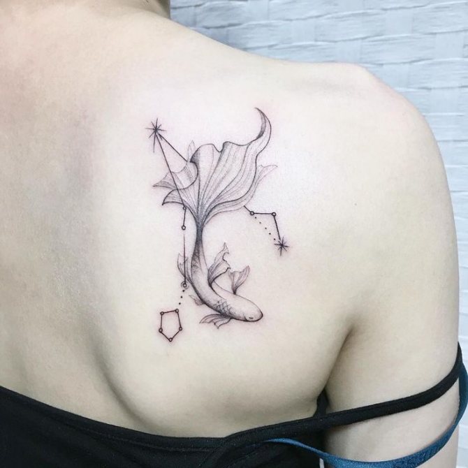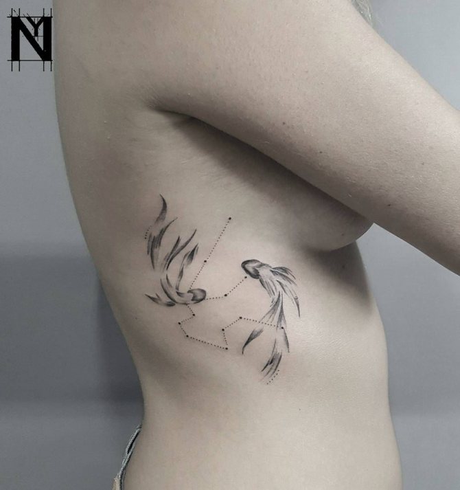 Les Poissons appartiennent à l'élément eau et sont patronnés par la planète Neptune. Les Poissons se caractérisent par un ballottement constant entre le passé et l'avenir, ainsi que par une paix intérieure constante. En même temps, ils ont des idéaux élevés et attendent beaucoup de la vie. Le tatouage d'un Poisson aidera à se concentrer sur les choses les plus importantes de la vie sans céder aux futilités.