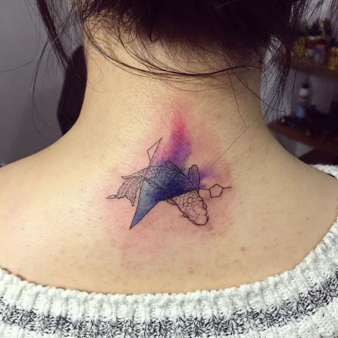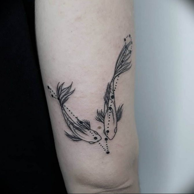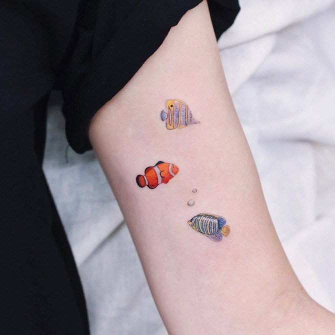 Le tatouage de poisson est très beau et inhabituel. Très souvent, le tatouage est réalisé dans un style minimaliste. Pour l'application de ces chiffres, on choisit de manière caractéristique la couleur noire classique, mais il existe aussi des motifs multicolores de petite taille. En règle générale, les tatouages réalisés selon cette technique ne nécessitent pas d'éléments supplémentaires. Très souvent, on trouve de petites variantes sur le doigt, le poignet, le cou, l'omoplate ou la cheville.