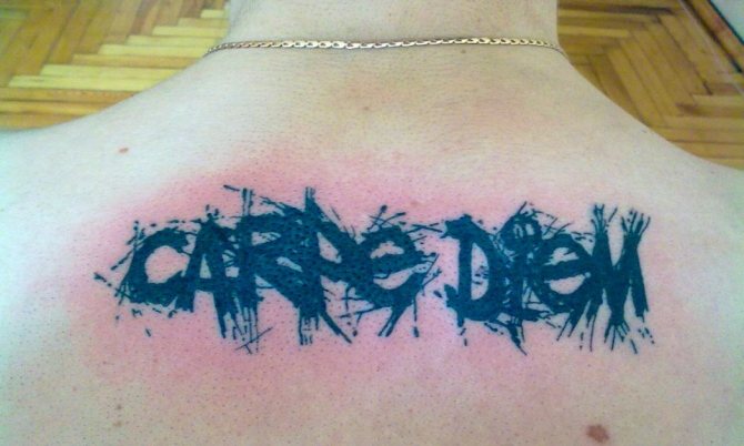 Souvent les gars demandent au maître de clouer un dicton d'un ancien sage ou chef de guerre, des aphorismes, des citations de grands hommes. N'importe quelle partie du corps convient pour un tel tatouage. Parmi les inscriptions tatouées, on trouve des dictons griffonnés en écriture indienne, en caractères chinois ou japonais, et en latin.