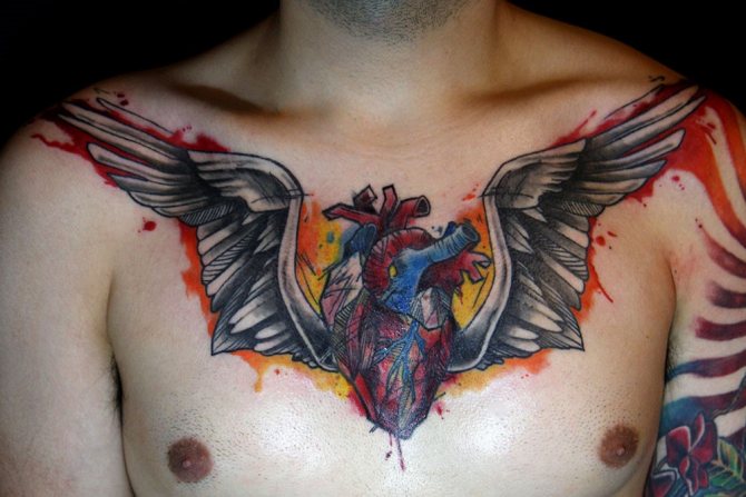 2Avec les ailes d'un ange. Des ailes peuvent pousser à partir du cœur, le contourner, voler vers le haut. En général, cette variante est préférée par les hommes, car elle prend beaucoup de place sur le corps. Le motif est placé sur la poitrine et le dos.