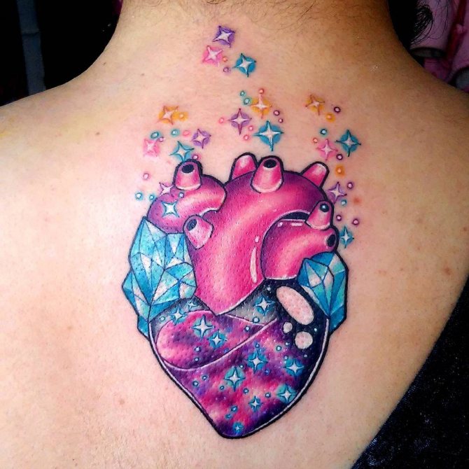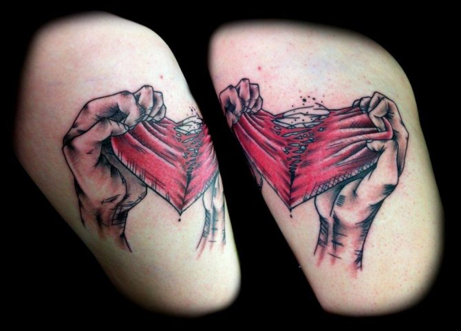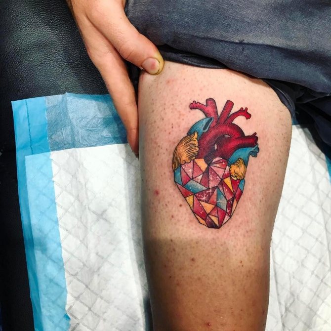 Il n'est pas rare de voir des personnes audacieuses qui ont représenté le cœur humain bien réel sur leur corps, y compris les vaisseaux sanguins et autres parties internes de l'être humain. De l'avis de nombreuses personnes, ces tatouages sont très étranges. N'épargnez pas l'image globale et les éléments supplémentaires sous forme de formes géométriques ou de pierres précieuses.