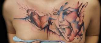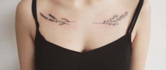 Parmi les avantages de l'application de tatouages sur la poitrine, les experts soulignent la nature discrète de l'image et la relative indolence de la procédure. En même temps, il est pratique de prendre soin de la peau de votre poitrine après une visite au salon de tatouage.