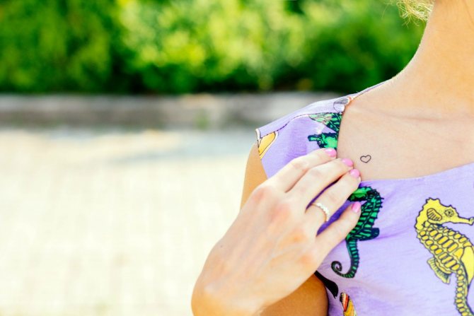 Le minimalisme n'est pas seulement tendance dans le monde de la mode en ce moment. Le look des petits cœurs sur le corps féminin est plutôt non conventionnel, bien que de nombreuses filles considèrent qu'un simple cœur miniature en noir est trop décontracté. Mais lorsque vous ajoutez du rouge à la forme noire du cœur, la situation change. Si le cœur noir est ombragé comme une empreinte digitale, vous pouvez obtenir un tatouage étonnant qui montre que le cœur du porteur appartient à une seule personne. Après tout, tout le monde le sait : les empreintes digitales de chacun sont uniques et non reproductibles.