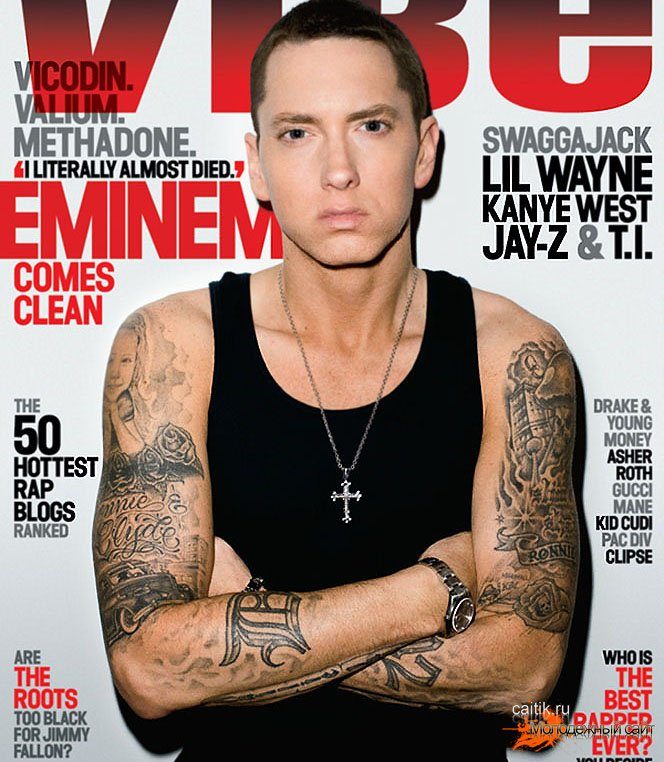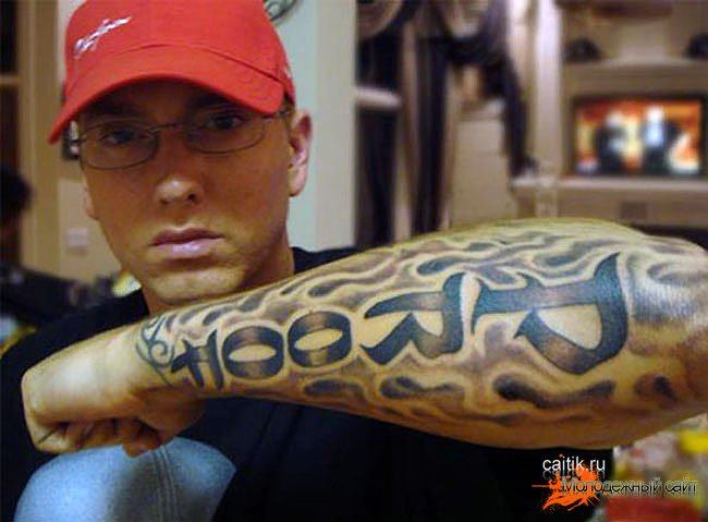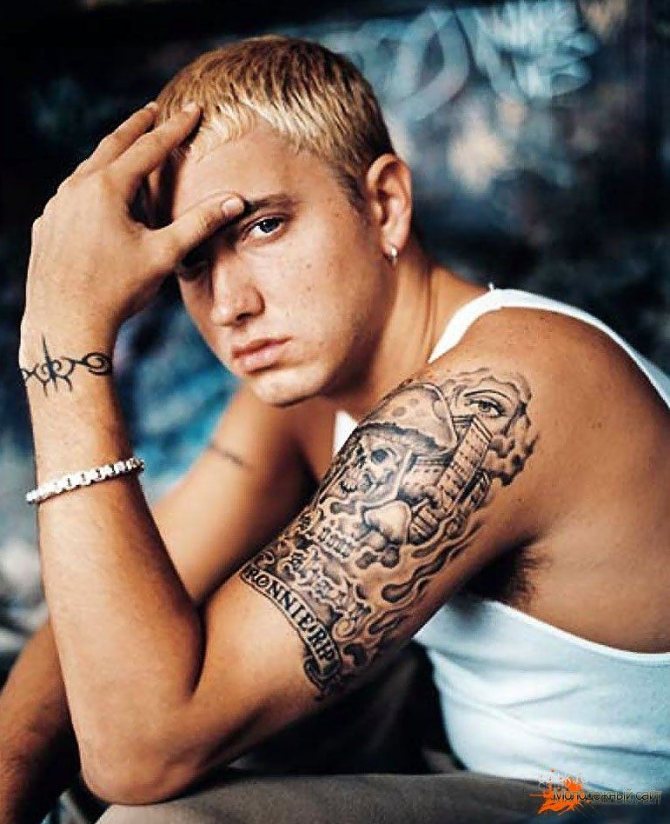 Eminem n'est pas à la traîne de ses pairs et porte son "iconostase" sur son corps. Les paparazzi ont compté une dizaine de dessins sur le corps du rappeur blanc. L'interprète a un bracelet au poignet gauche, qui était l'un des premiers sur le corps du chanteur. Le tatouage a été fait en état d'ébriété. Néanmoins, pour Eminem lui-même, le dessin a une signification particulière.