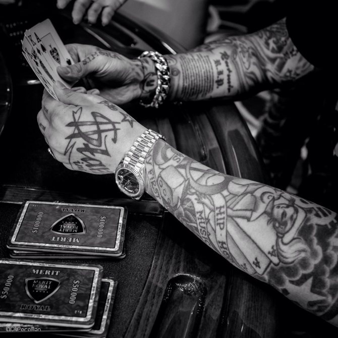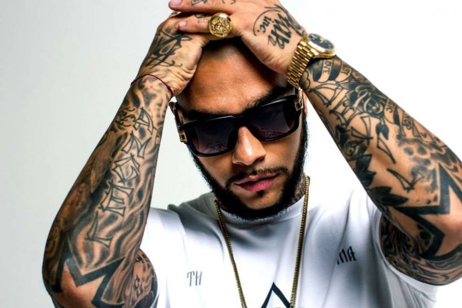 Les rappeurs constituent peut-être le groupe de personnes le plus intéressant pour ceux qui s'intéressent à l'art du tatouage. Leurs corps sont couverts de toutes sortes d'inscriptions, de slogans, d'images insolentes et autres attributs de la sous-culture.