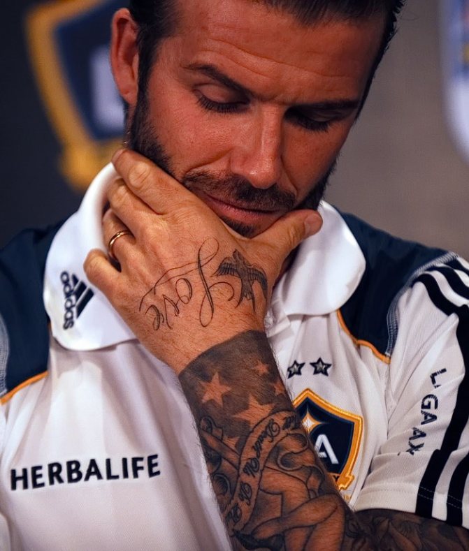 Le célèbre footballeur David Beckham a plus de 20 tatouages, dont chacun a une signification particulière, non seulement pour David, mais aussi pour toute sa famille. Le plus important est le tatouage du nom de sa femme Victoria, qui est réalisé en hindi sur sa main gauche, juste au-dessus du poignet. Ce tatouage se compose de 4 parties. Ce qui est étonnant avec ce tatouage, c'est qu'en hindi, il n'existe aucun mot équivalent au nom de la femme du footballeur. Ainsi, afin de faire ce qui a été conçu pour représenter différentes parties, qui seront traduites pour signifier un seul mot - Victoria. La star du football porte le numéro 7 sur son bras droit, car c'est le numéro qu'il utilise pour jouer pour son équipe, Manchester United. David Beckham a plusieurs tatouages dans le dos à la fois : un ange gardien entouré des noms de ses fils. Le footballeur en a trois.