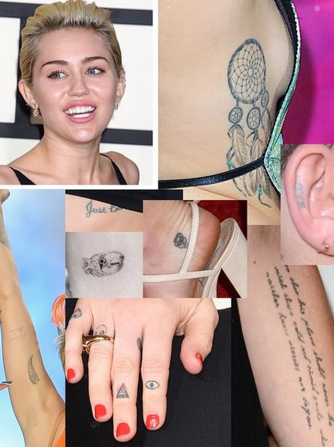L'interprète du rôle principal de la série "Hannah Montana" estime que le tatouage n'est pas seulement un dessin, mais une occasion d'exprimer tous ses sentiments secrets, de découvrir de nouvelles capacités en soi et de se protéger des regards inamicaux et négatifs. Miley a 18 tatouages, chacun ayant une signification particulière. Sous son sein gauche se trouve un tatouage sur lequel on peut lire : "Just Breathe" - une sorte d'attitude pour se battre en toutes circonstances et continuer à vivre. Et une image sur sa cheville sous la forme du symbole OM permet à l'actrice de découvrir de nouveaux talents et de se développer spirituellement. Parmi les tatouages de Miley Cyrus figurent le mot "Love" à l'intérieur de son oreille droite et un cœur sur les doigts de sa main droite.