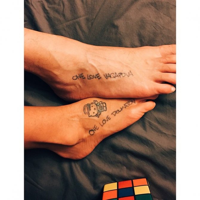 Pour Aiza, le tatouage est considéré comme un moyen d'exprimer ses sentiments profonds pour Guf, avec qui elle est en couple. Plus d'un tatouage a été placé sur le corps de la jeune fille. Il s'agit le plus souvent d'images et de personnages de dessins animés. Sur son poignet et le bas de sa jambe, Aiza a des images de petites filles et sur le bas de son abdomen, il y a le Petit Poucet et des inscriptions. En signe de leur amour et de leur dévouement éternels l'un envers l'autre, le couple a échangé des inscriptions avec le nom de famille de l'autre moitié. Ainsi, le rappeur a "One love Vagapova" imprimé sur son pied, tandis que sa femme a "One love Dolmatov". Quelle bonne idée !