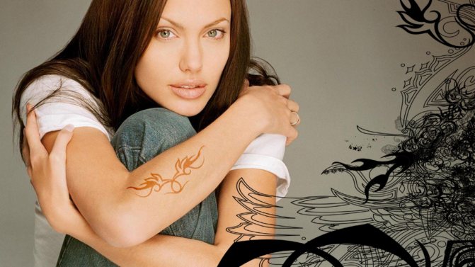 Parmi les célébrités les plus célèbres avec des tatouages figure l'actrice hollywoodienne Angelina Jolie, qui en compte 12. Son tatouage le plus célèbre est celui des coordonnées des lieux de naissance de ses enfants, Jolie elle-même et Brad Pitt. Parmi les autres motifs figurent un tigre, un tatouage bouddhiste, un hiéroglyphe arabe, le chiffre 13, l'inscription latine "Quod me netrit me destruit", qui signifie "Ce qui me nourrit me tue aussi", etc.