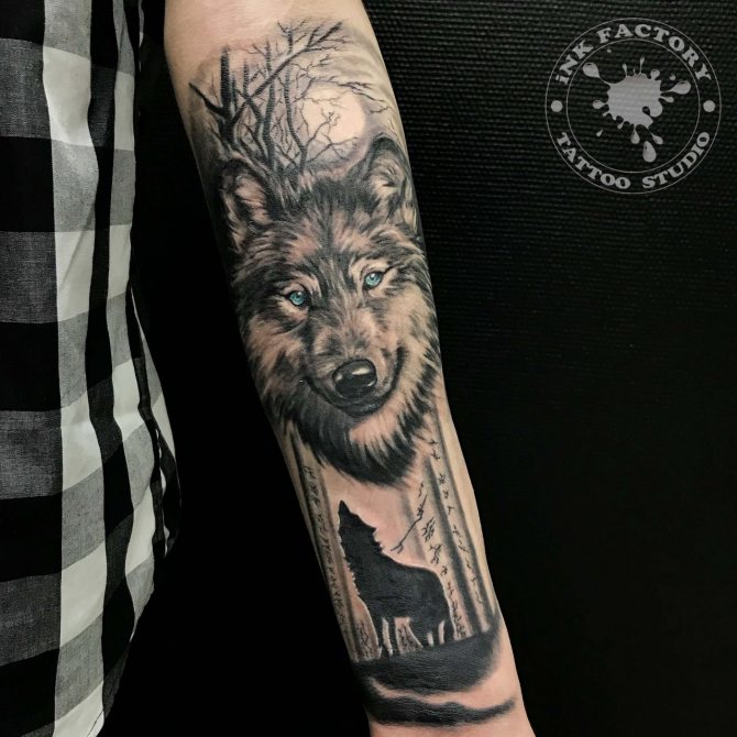 | Dos, côté, poitrine, jambe ou manche complète | Une certaine superficie de ces parties du corps permet d'obtenir une composition suffisamment colorée. Un loup peut être tatoué en entier ou combiné avec d'autres animaux. Vous pouvez empailler le prédateur lors d'une attaque ou une illustration d'un loup dans la nature. |