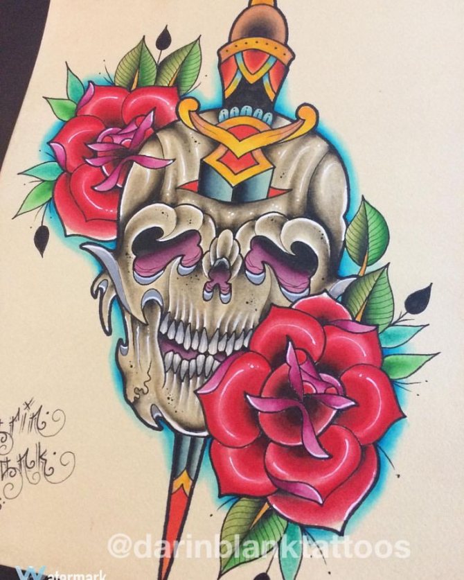 Le style suivant est devenu très populaire parmi les marins européens dès le XIXe siècle. Et au fil du temps, il n'a pas perdu de son intérêt. Les roses, les crânes, les rubans et les ancres sont tous des éléments caractéristiques du style Old School et ne sont en aucun cas dénués de signification. Les marins étaient connus pour leur superstition, alors lorsqu'ils se faisaient tatouer le corps, ils y mettaient du sens.