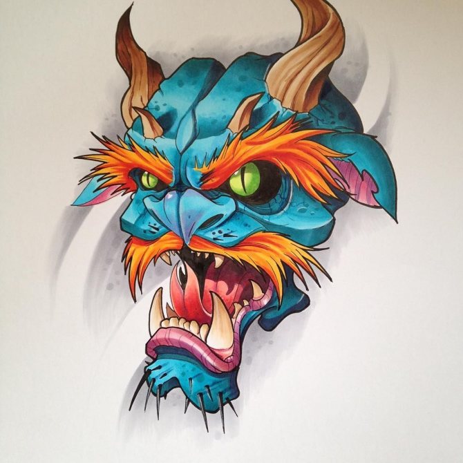 Une autre caractéristique des tatouages Old School est l'abondance de couleurs différentes. Généralement très lumineux, et un contour extérieur noir épais. Les tatouages de ce style sont une sorte d'antithèse du style Réalisme. Après tout, si les images du Réalisme sont comparées à des photographies, les tatouages Old School sont réalisés dans un style cartoon.