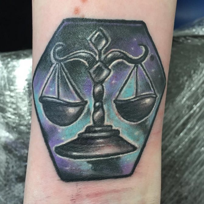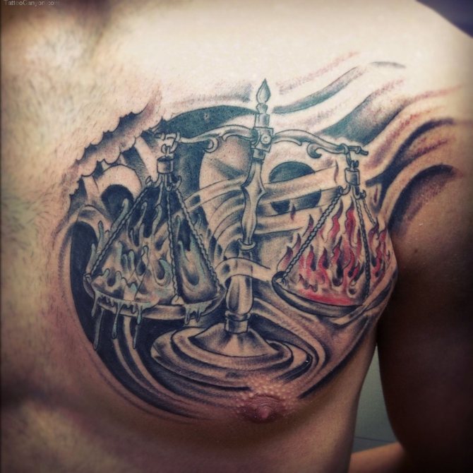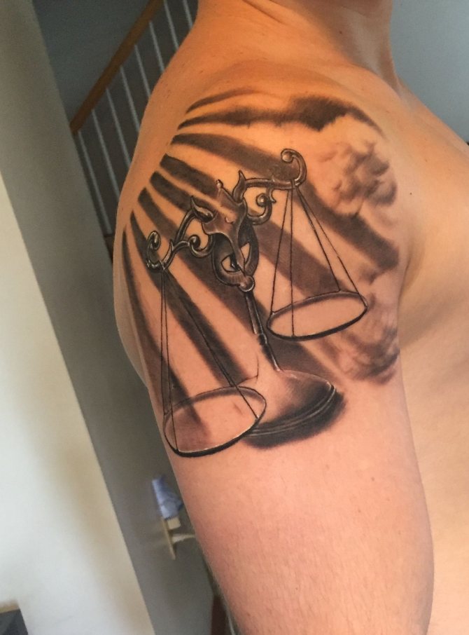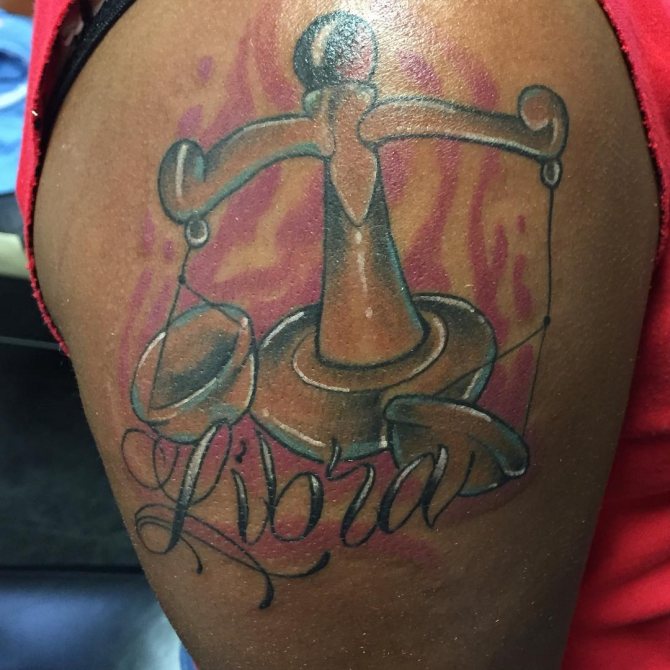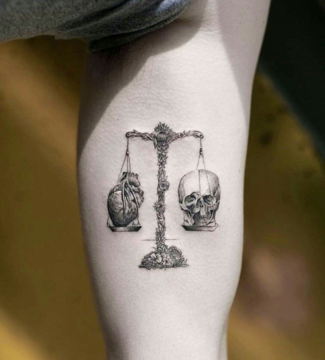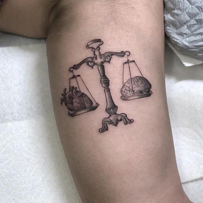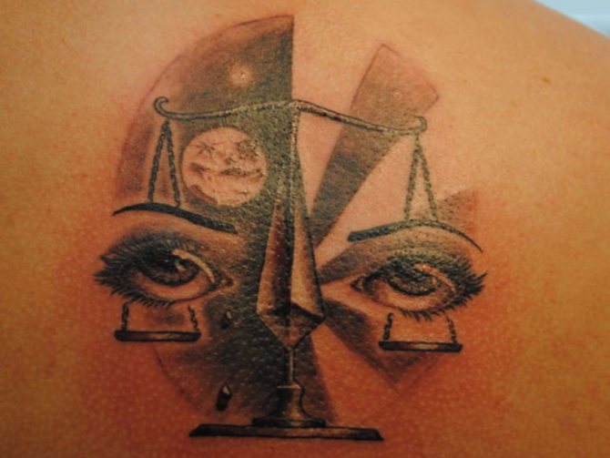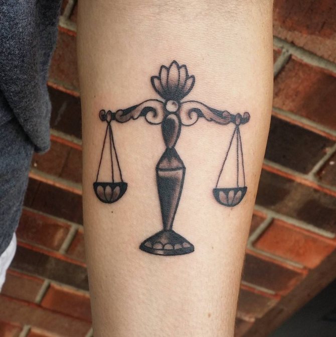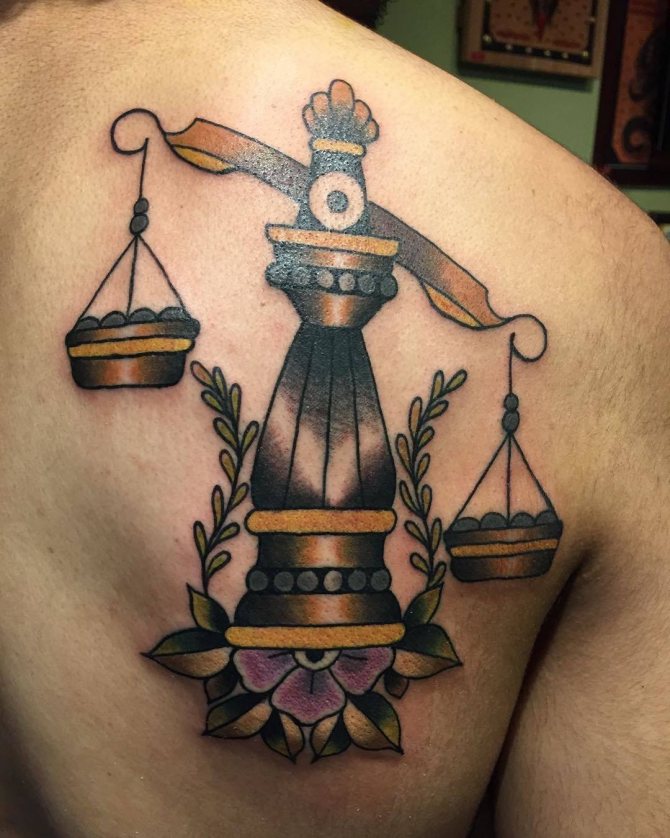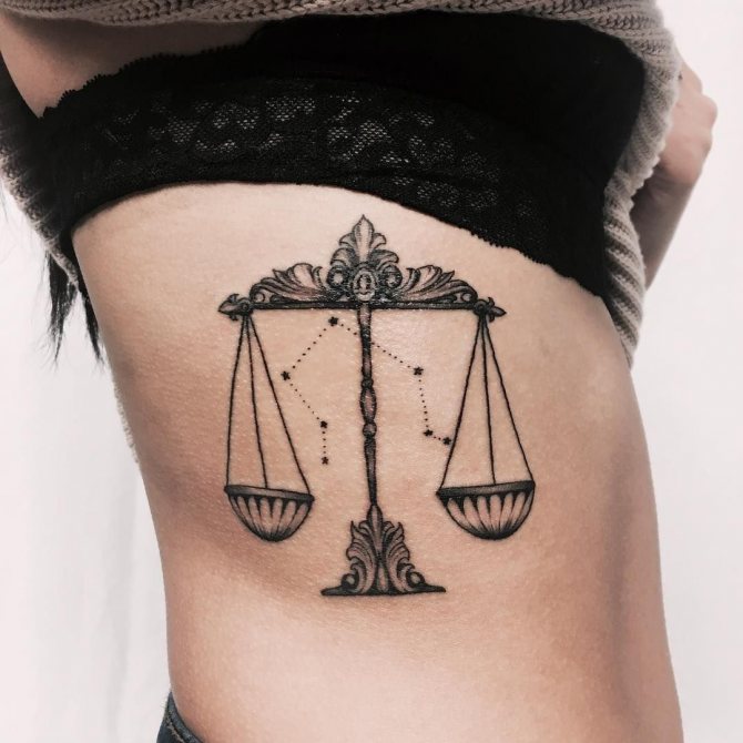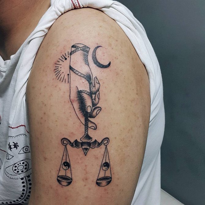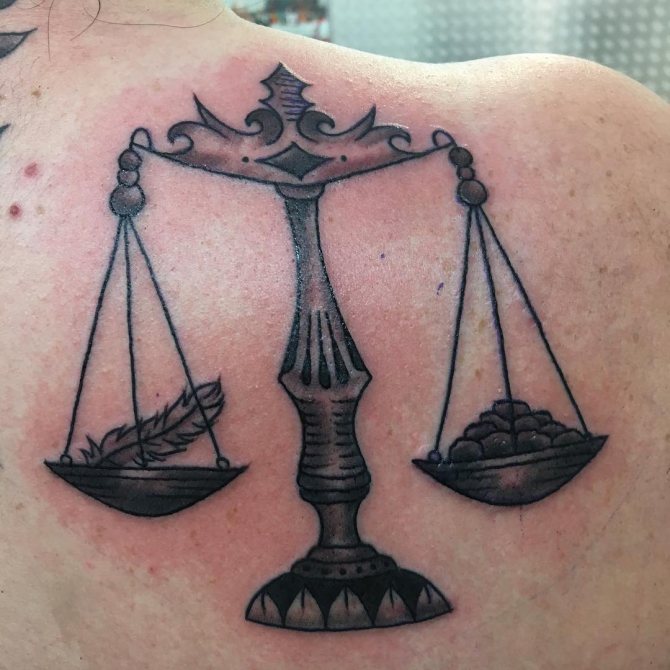 C'est peut-être le seul signe du zodiaque dont les images ont la même signification dans les tatouages masculins et féminins. Les jeunes femmes préfèrent compléter les modèles qu'elles ont choisis par divers détails sous forme de chaînes, de rubans, de cœurs ou de fleurs. Le tatouage du signe astrologique de la Balance sur le corps de la femme peut témoigner de l'amour de sa propriétaire, de sa tranquillité et de son harmonie avec le monde extérieur. Pour les hommes, le signe de la Balance peut symboliser la souplesse et l'objectivité de l'esprit, et souligner la capacité de son propriétaire à conserver des positions claires dans la vie. Divers détails tels que des poignards ou des éclairs sont utilisés pour compléter les échelles.