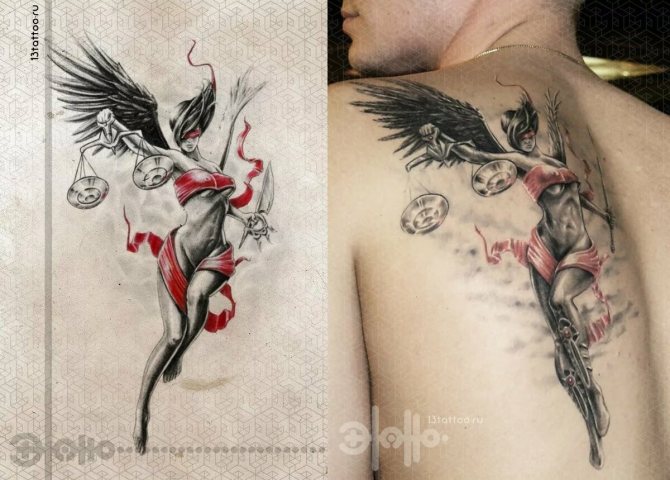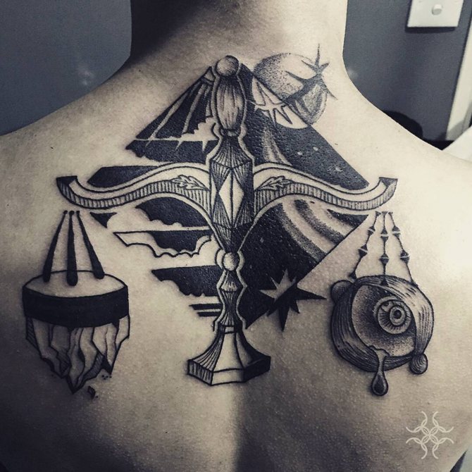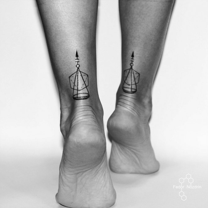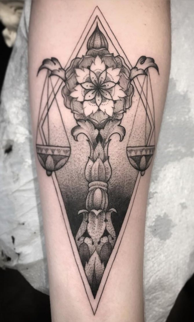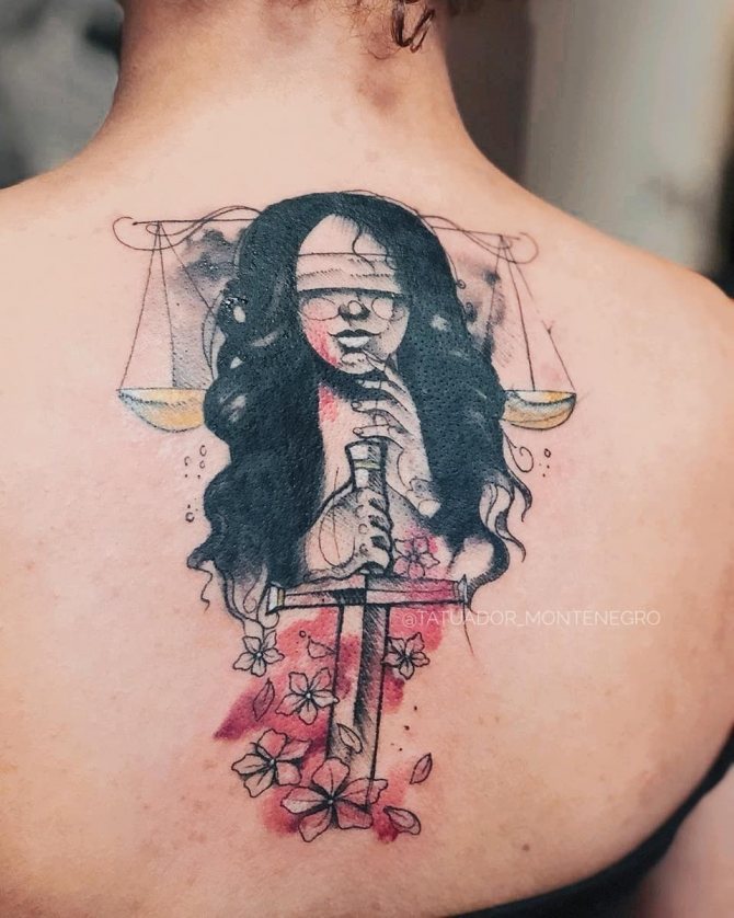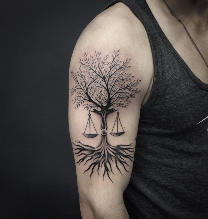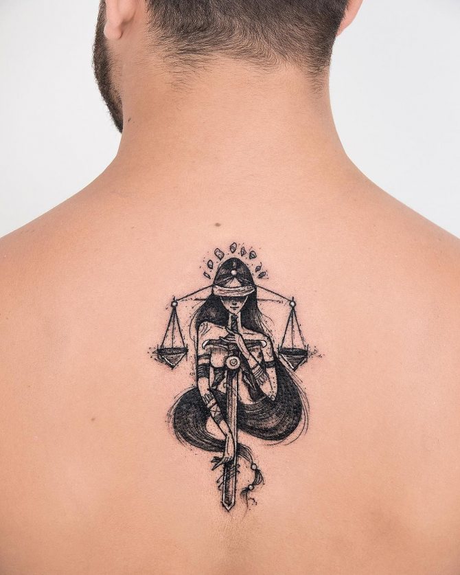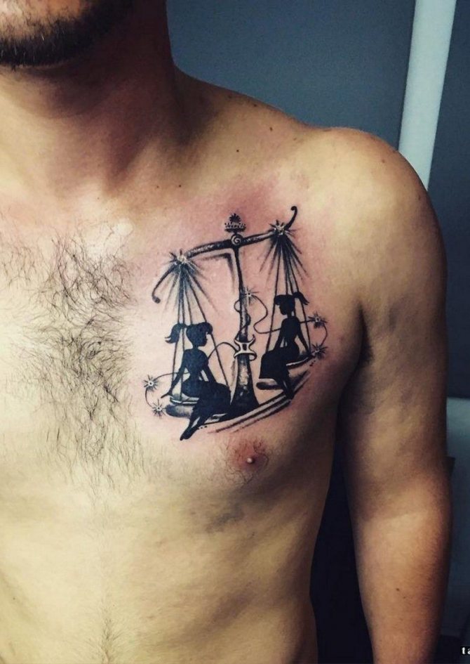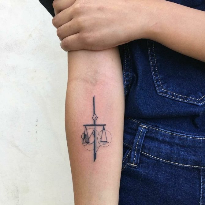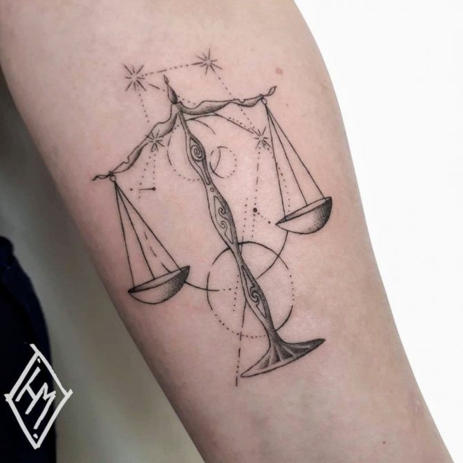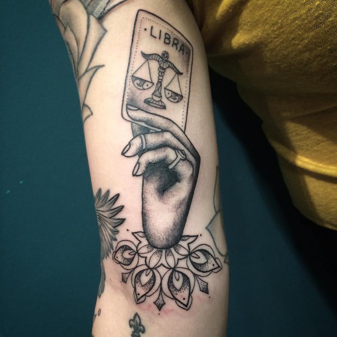 C'est peut-être le seul signe du zodiaque dont les images ont la même signification dans les tatouages masculins et féminins. Les jeunes femmes préfèrent compléter les modèles qu'elles ont choisis par divers détails sous forme de chaînes, de rubans, de cœurs ou de fleurs. Le tatouage du signe astrologique de la Balance sur le corps de la femme peut témoigner de l'amour de sa propriétaire, de sa tranquillité et de son harmonie avec le monde extérieur. Pour les hommes, le signe de la Balance peut symboliser la souplesse et l'objectivité de l'esprit, et souligner la capacité de son propriétaire à conserver des positions claires dans la vie. Divers détails tels que des poignards ou des éclairs sont utilisés pour compléter les échelles.