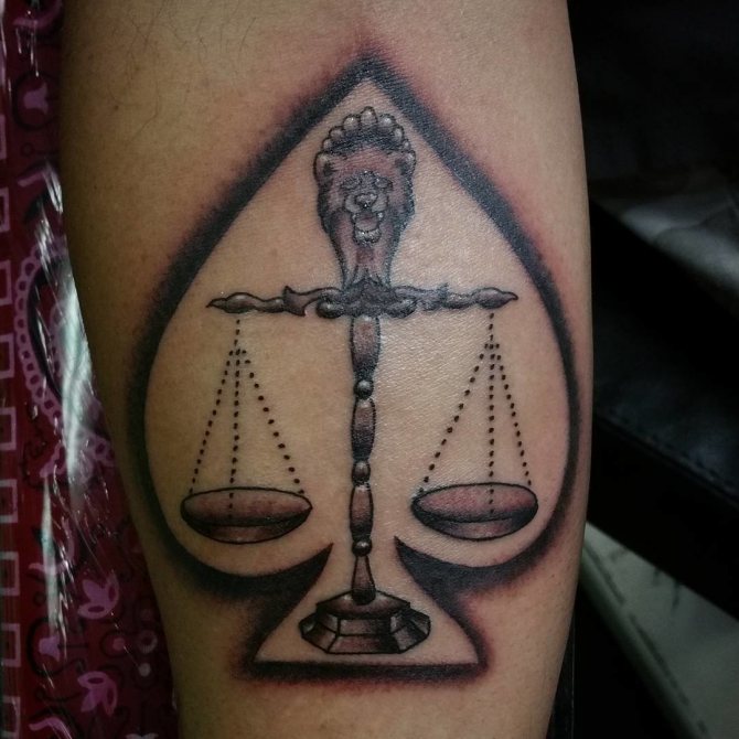 L'image de la balance implique la présence dans le croquis d'un objet du même nom, les bols qui peuvent être situés horizontalement, ou sur un côté. En même temps, les bols représentent souvent des détails qui ont du poids pour chaque tatoueur individuellement, comme le cerveau humain, l'argent, le cœur et bien d'autres exemples. Il existe également des croquis de balances tenant Thémis dans leurs mains, de balances contre un arbre avec des racines, de balances avec des ailes d'ange, contre un ciel étoilé, avec des inscriptions et bien d'autres idées.