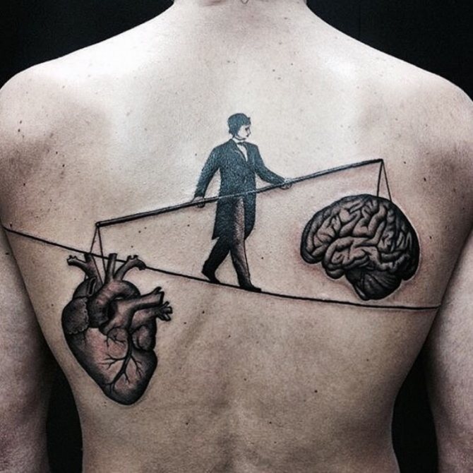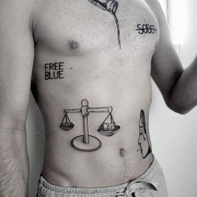 Le tatouage avec les bols dans la même position symbolise l'objectivité de la personne, sa perception impartiale de la réalité. Le tatouage de la balance équilibrée peut également signifier la paix intérieure, des pensées et des actions inébranlables.