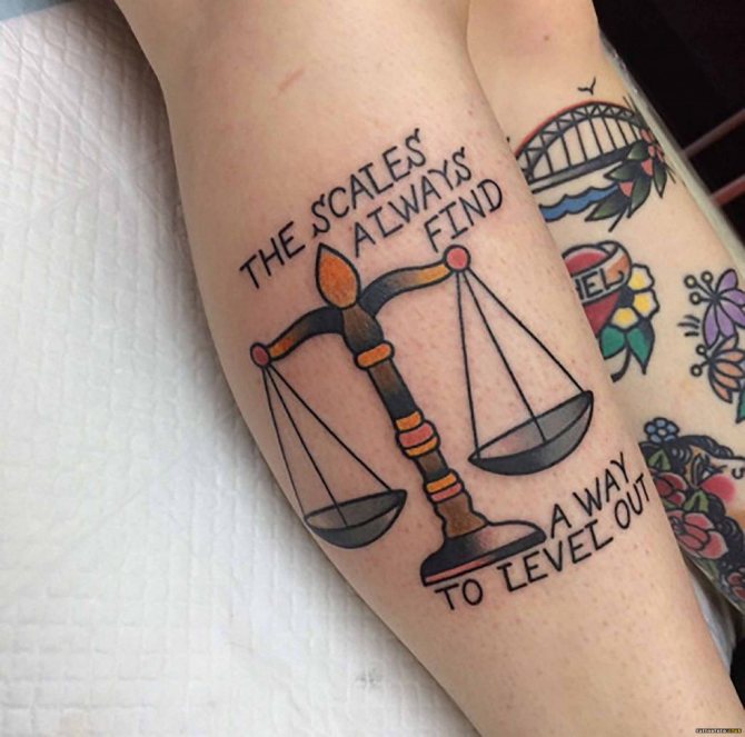 L'interprétation moderne des échelles a une signification psychologique profonde. Ils montrent que l'on s'efforce d'atteindre l'harmonie dans la vie et que l'on ne tolère pas les extrêmes. Les tatouages avec une balance sont réalisés non seulement par les personnes nées du 24 septembre au 22 octobre, mais aussi par d'autres personnes qui souhaitent trouver un équilibre et un compromis dans toutes leurs entreprises.