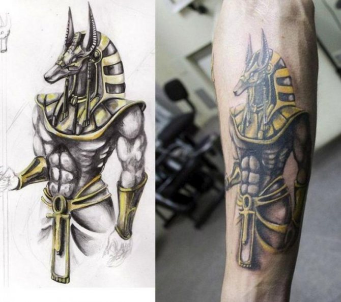 Une grande image du dieu avec certains attributs et d'autres représentants de la mythologie égyptienne ancienne peut être réalisée sur la poitrine. Par exemple, Anubis peut être représenté avec Upuat, le dieu qui aidait à conduire les gens au ciel, ou avec Kebhut. Elle est la déesse de l'embaumement, de l'eau pure et la fille d'Anubis. Kebhut protégeait les corps des morts de la décomposition. Un tatouage de son image protégera la personne contre les mutilations et renforcer l'influence d'Anubis.