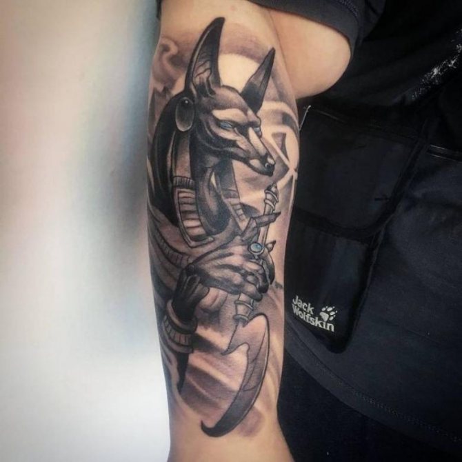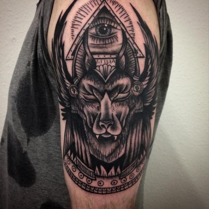 Si vous ne voulez pas ajouter de détails au dessin du dieu, un tatouage peut être placé sur l'épaule. Le design minimaliste y sera parfait. Sur les bras et les jambes, un tel tatouage fera également bonne figure. Vous pouvez faire encrer tout l'avant-bras ou la partie inférieure de la jambe, ce qui permet de réaliser une manche avec de nombreux petits détails.