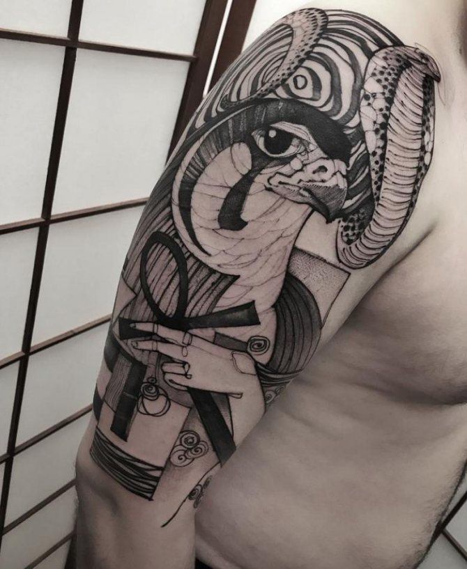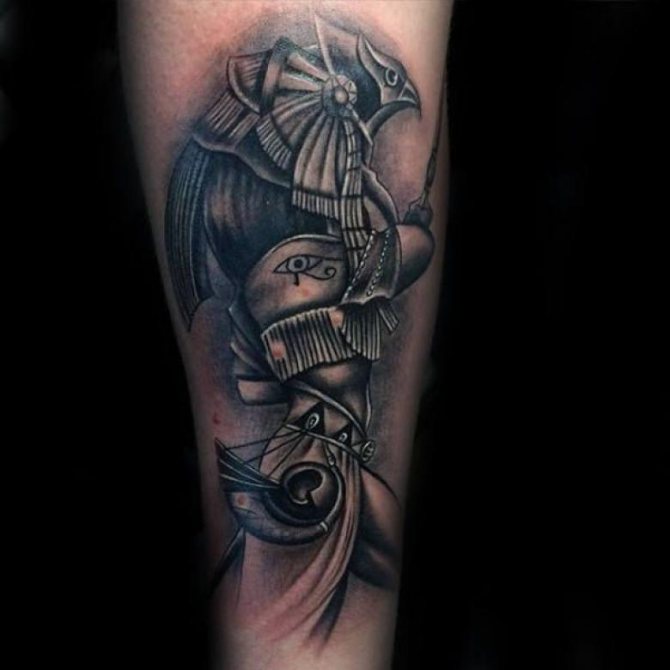 Les Égyptiens croyaient que ce dieu particulier était celui qui gouverne les luminaires célestes, transformant le jour en nuit et la nuit en jour. Habituellement, les tatouages avec une telle image corporelle sont réalisés sur des personnes qui s'intéressent à la mythologie et à l'histoire, et qui croient au patronage de puissances supérieures.