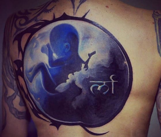 Un autre tatouage sur son dos se trouve juste en dessous de l'embryon, sous la forme d'une figure symétrique à motifs.