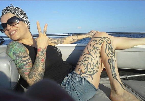 Sur sa jambe gauche se trouve également un bracelet, sur lequel est assise une araignée. L'interprétation de ce tatouage est inconnue.