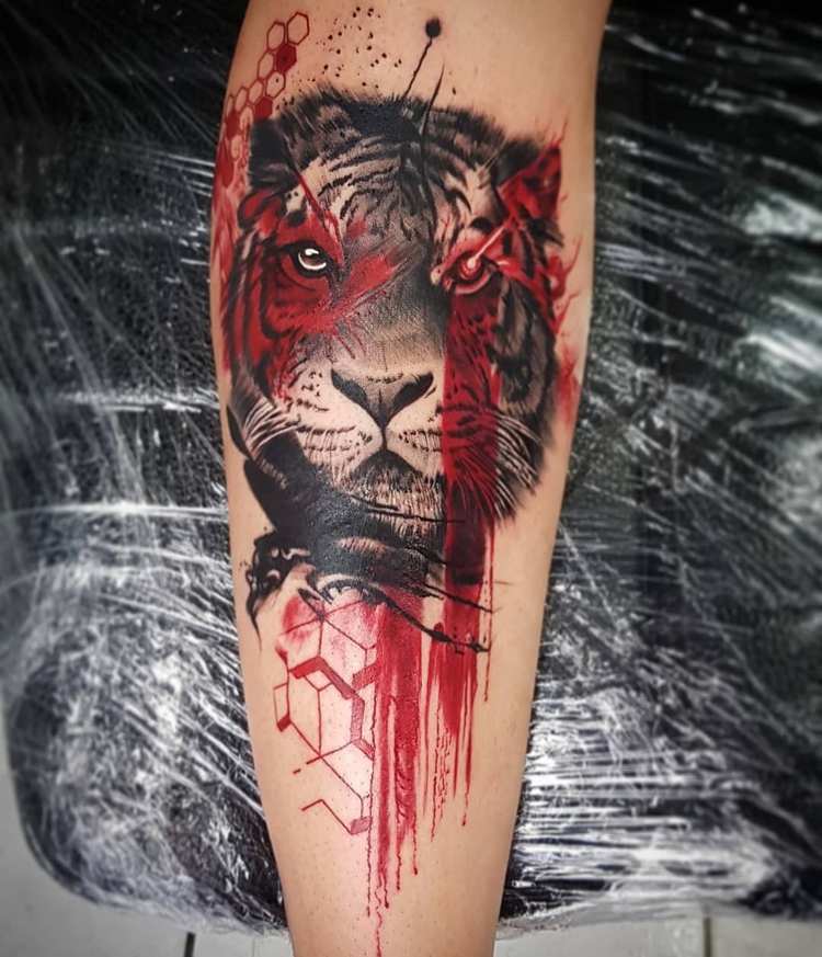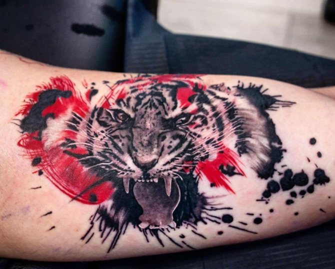 Le tatouage du tigre avec des éléments d'abstraction est une approche audacieuse et créative de la façon dont la réalité est reflétée. Dans les œuvres de ce style, l'image universellement reconnaissable est soumise à une modification totale, en recourant à l'expérimentation des couleurs vives et des formes du fond. Les yeux et les rayures restent les identifiants de l'image du prédateur.