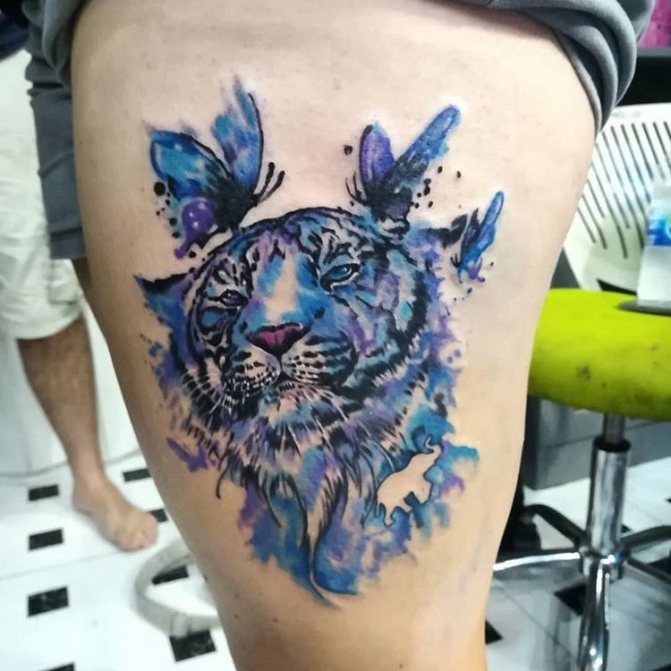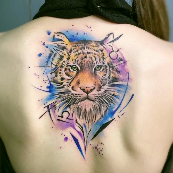 Un tigre dans le style aquarelle. Ses caractéristiques sont colorées et floues. Ces tatouages sont généralement préférés par les filles et les femmes mignonnes. Les peintures sont douces, touchantes et féminines. L'essentiel est de choisir une palette de couleurs harmonieuse.