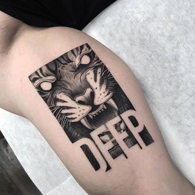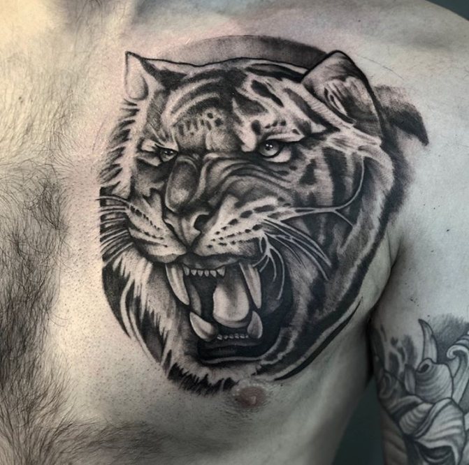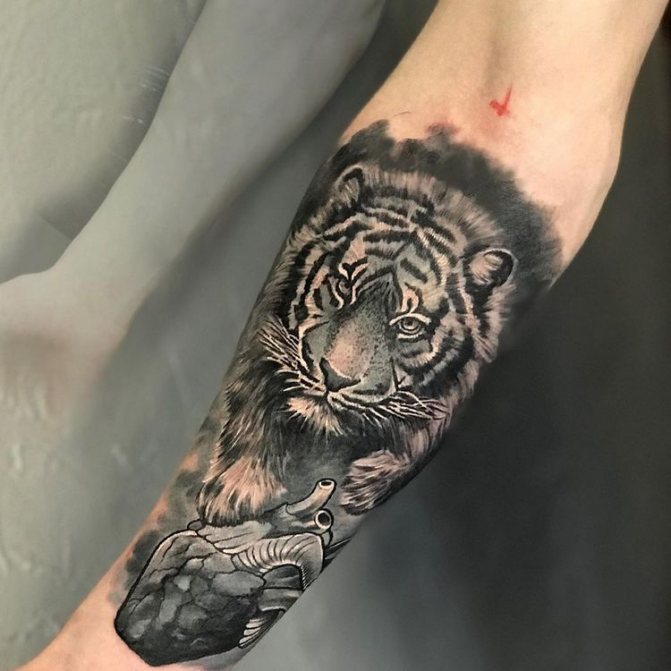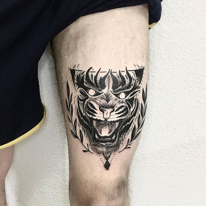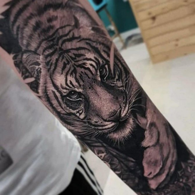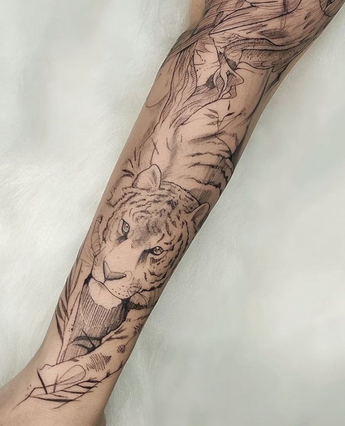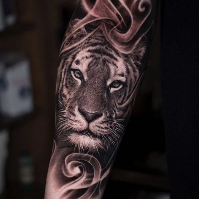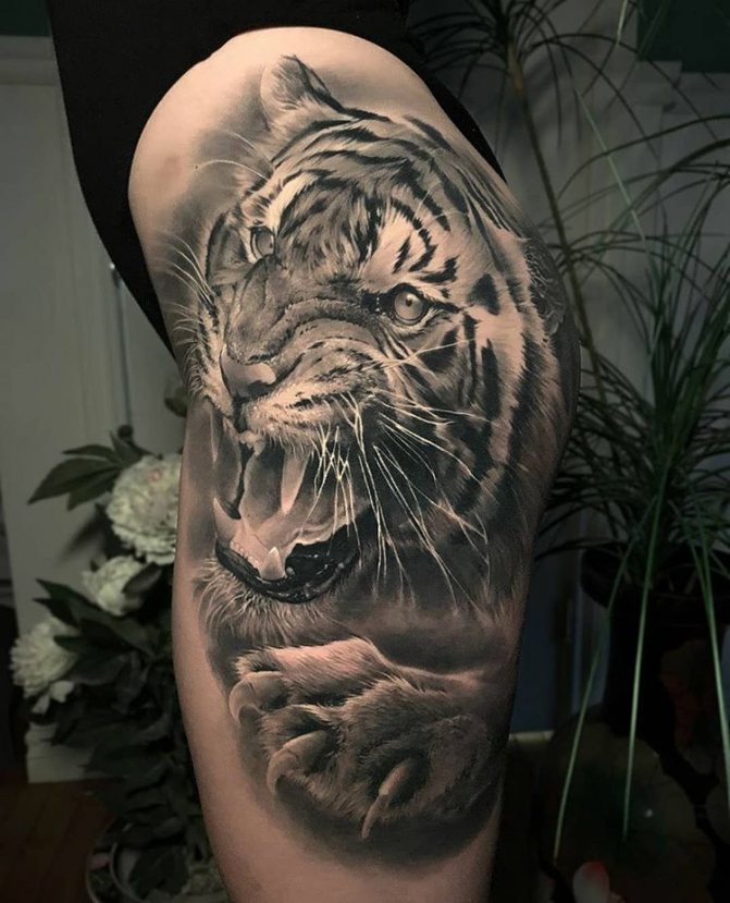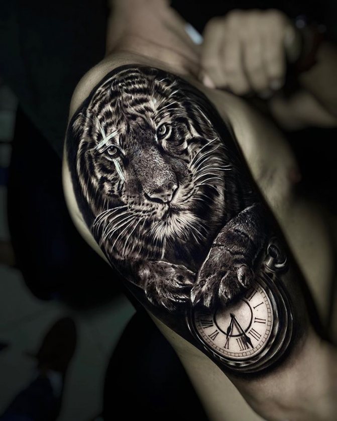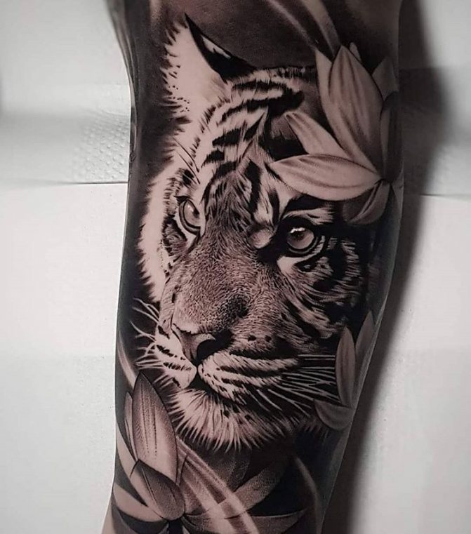 Le tatouage du tigre dans le style réaliste attire particulièrement l'attention de votre entourage. L'essentiel est que le tigre soit représenté dans toute sa splendeur, dans son environnement naturel. Allongé ou marchant sur l'herbe, situé sur un fond de montagnes ou dans d'autres lieux, mettant encore plus en valeur sa stature et sa beauté. Un tatouage comme celui-ci ne passera jamais inaperçu.