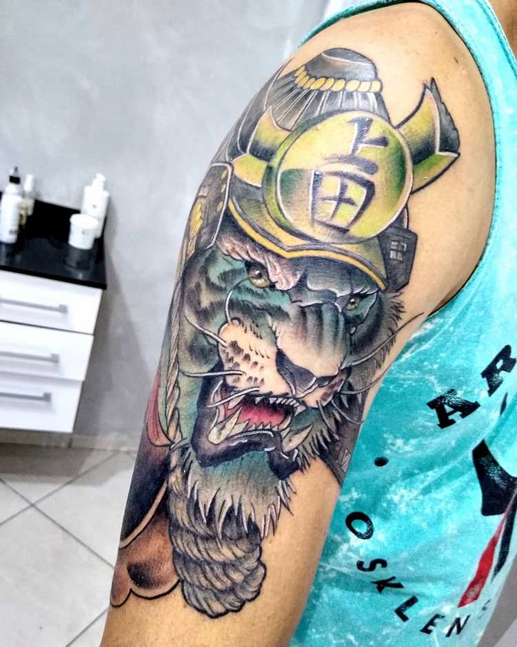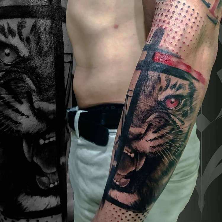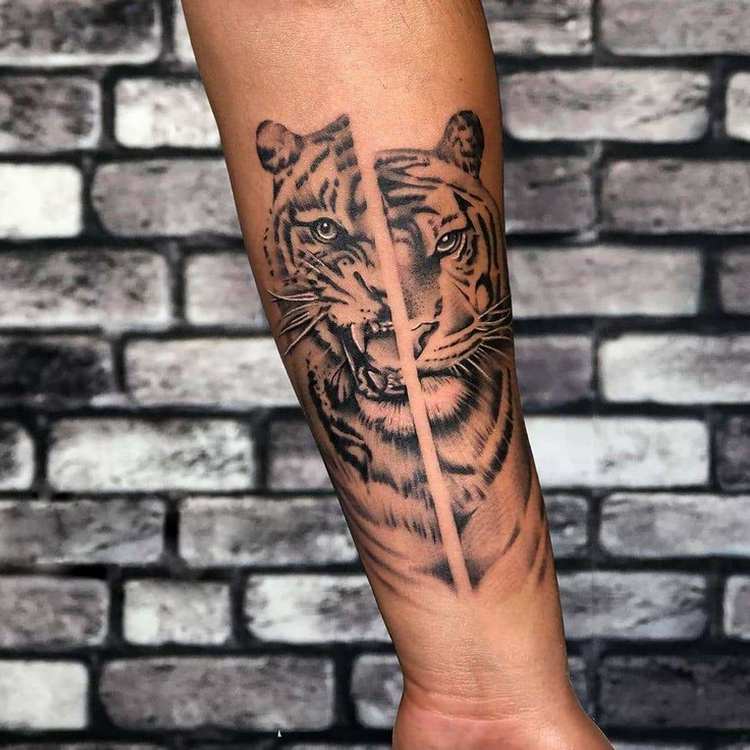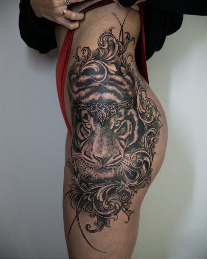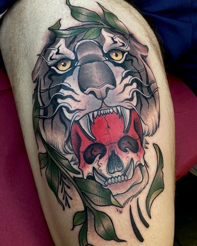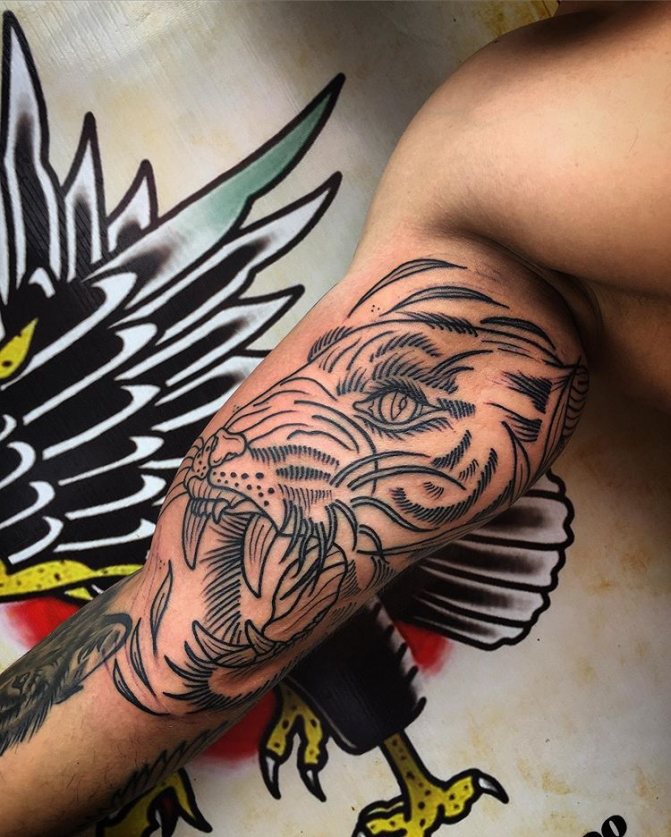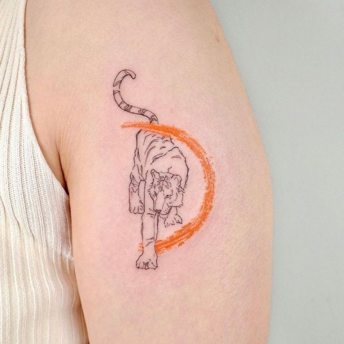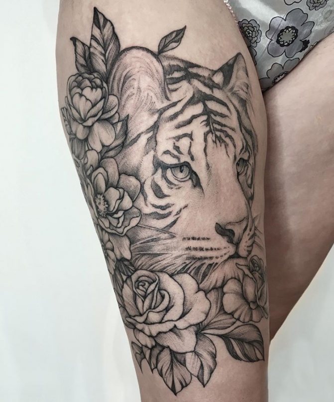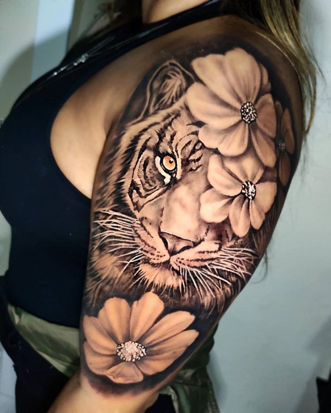 Le tatouage du tigre dans le style réaliste attire particulièrement l'attention de votre entourage. L'essentiel est que le tigre soit représenté dans toute sa splendeur, dans son environnement naturel. Allongé ou marchant sur l'herbe, situé sur un fond de montagnes ou dans d'autres lieux, mettant encore plus en valeur sa stature et sa beauté. Un tatouage comme celui-ci ne passera jamais inaperçu.