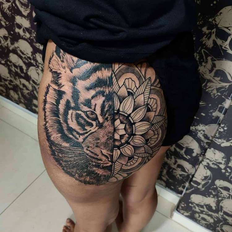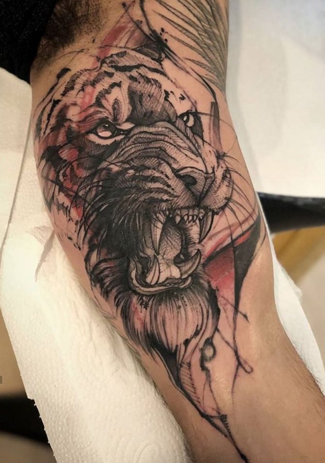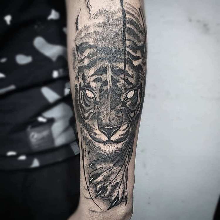 L'image tranquille et le rictus du tigre sont tout aussi étonnants dans les tatouages réalisés dans le style graphique. La palette de noir et de gris de l'image sur la peau, accentuée par endroits par un colorant blanc, parvient à capturer le charme artistique de l'art du dessin au crayon, également connu sous le nom de dessin académique.