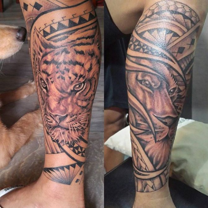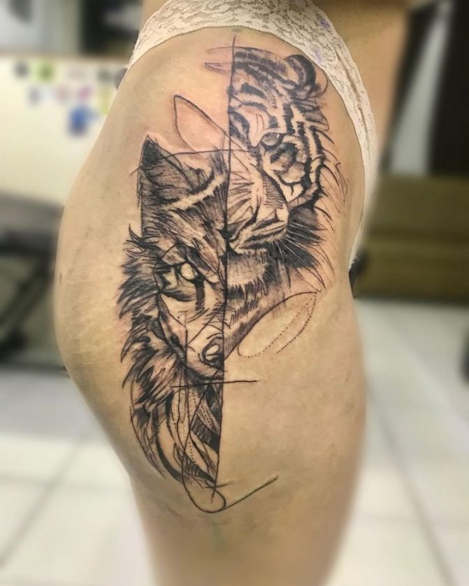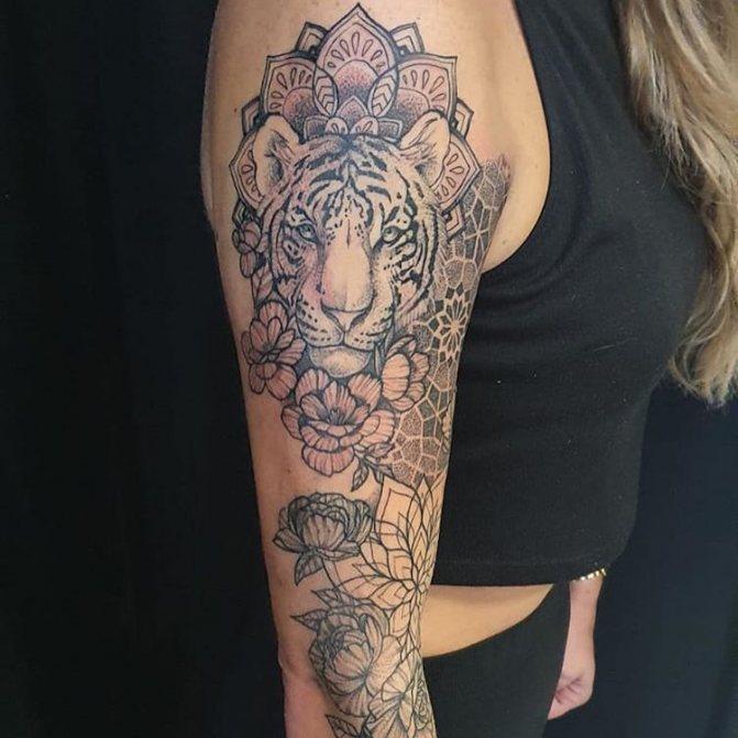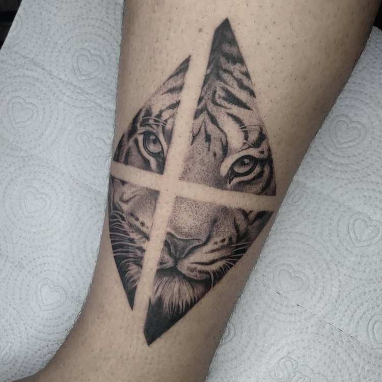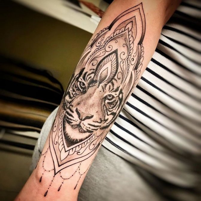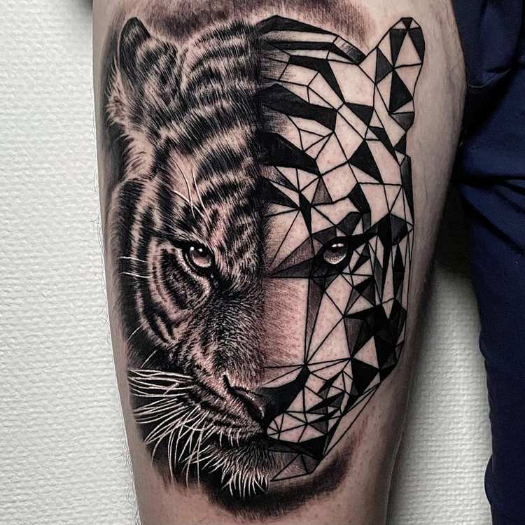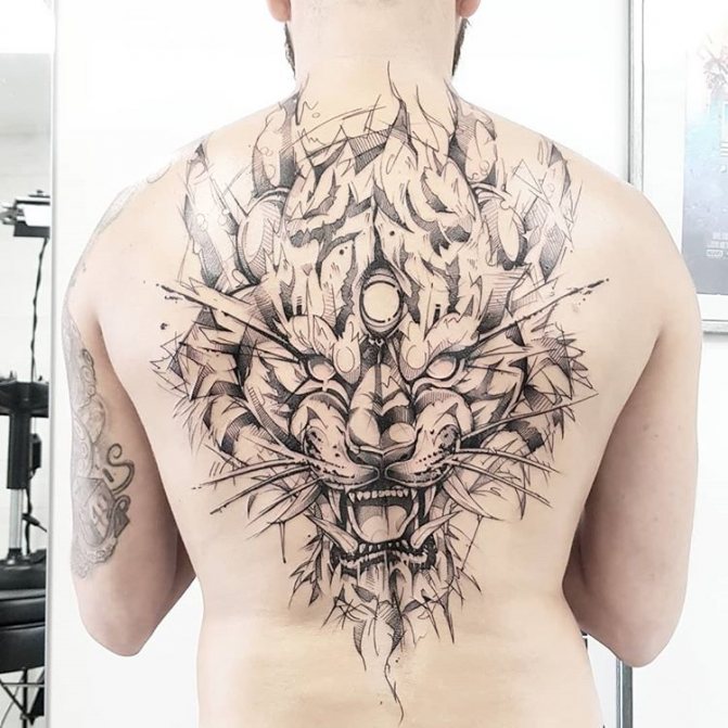 Le museau de l'animal est soit imprimé d'une forme géométrique, très prisée des amateurs de body-art, soit la tête du prédateur (ou la moitié de celle-ci) est représentée par une grille en 3D. En outre, la géométrie est capable de dessiner magnifiquement le fond entourant le tigre, avec des figures strictes, ce qui confère un caractère unique aux tatouages.