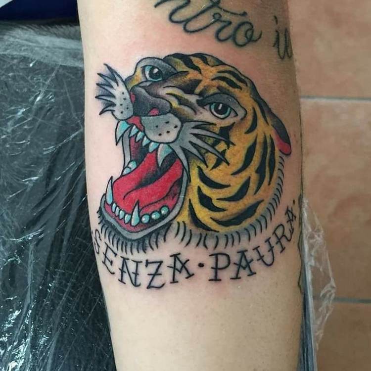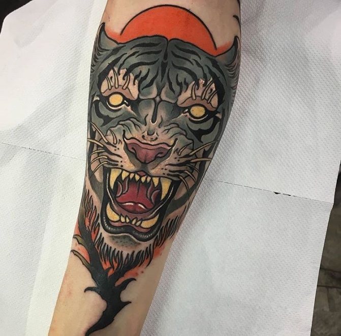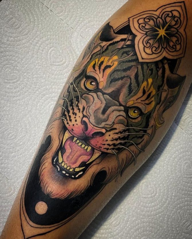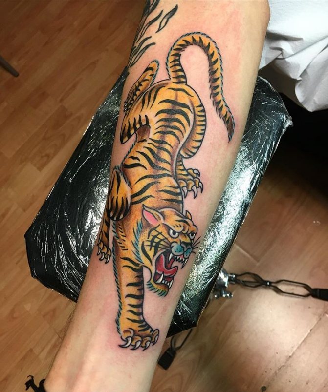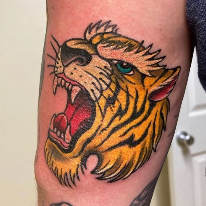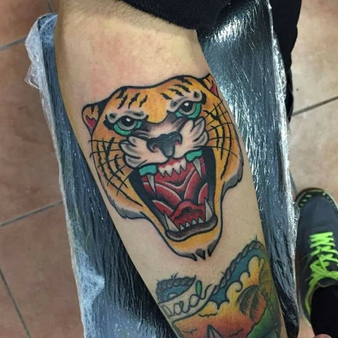 Dans la plupart des œuvres que nous avons rencontrées, le chat de proie est dessiné soit en noir et blanc, soit en jaune. La principale caractéristique de nombreux tatouages de tigre de style oldschool est la nature agressive de l'image, ou plutôt son rictus, qui est la marque des petits tatouages.