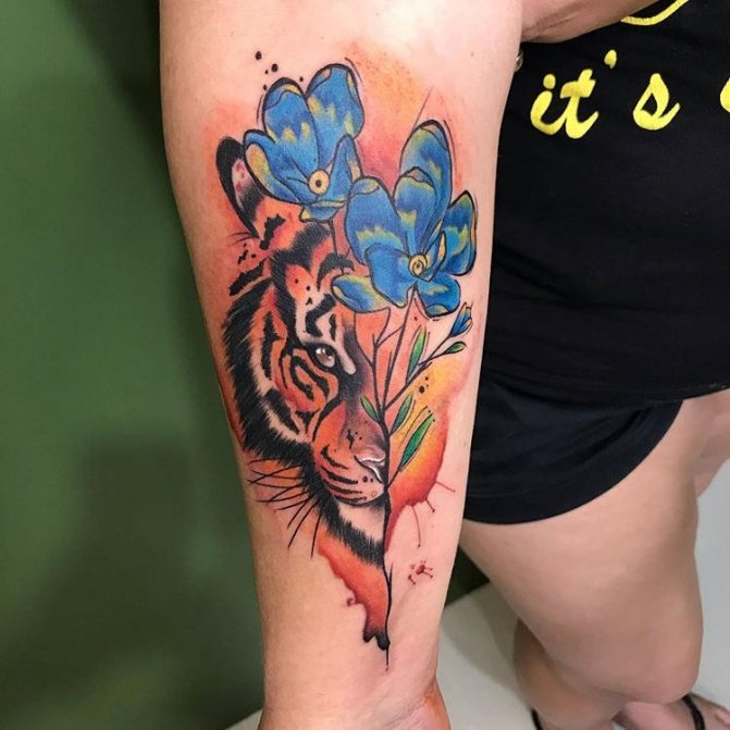 Si vous n'aimez pas les images réalistes, regardez à quoi ressemble un tatouage de tigre à l'aquarelle. La technique de l'aquarelle n'est pas seulement une nouvelle tendance en matière de body painting, c'est aussi un excellent moyen de créer un chef-d'œuvre unique sur le corps.