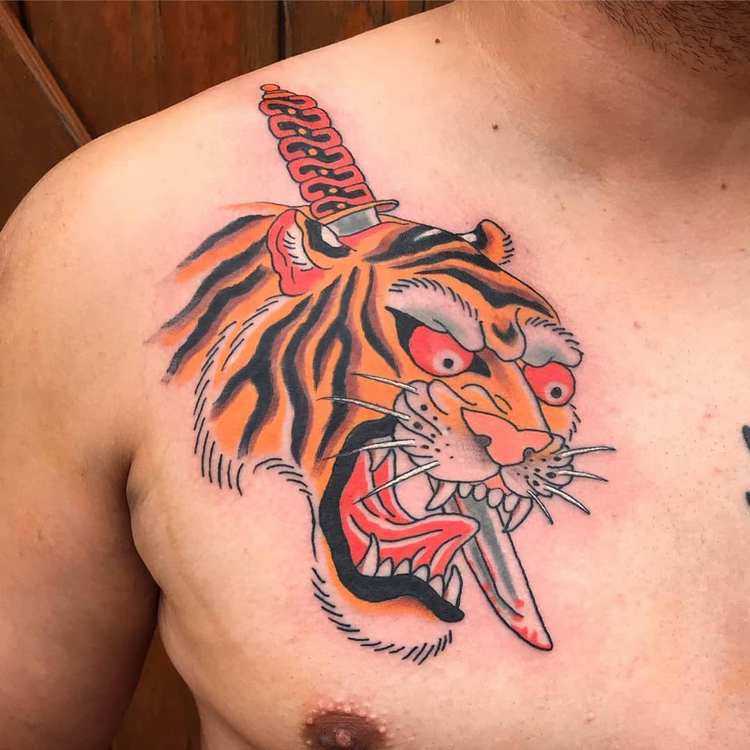 L'un des styles de tatouage les plus populaires du milieu des années 90 et le tigre n'est pas le moindre. Le type à motifs affichant des rayures noires pointues aux extrémités s'adapte le mieux à un design où les rayures du chat rayé s'accordent parfaitement avec les courbes standard du style. Le style Treble est toujours d'actualité.