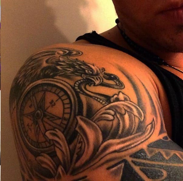 L'épaule gauche de l'acteur est ornée d'un tatouage symbolique représentant un compas et un faucon. Un tel croquis est réalisé par des personnes qui ont confiance en leurs actions, elles savent où aller, comment évoluer.